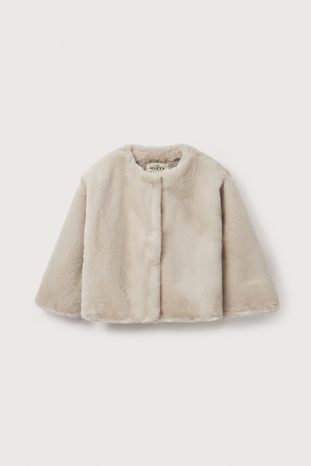 Notify me when its in stockBeige faux fur jacket with a crew neck, pockets, snap button front closure, and cotton lining offers a timeless and elegant look while providing comfort in cold weather.