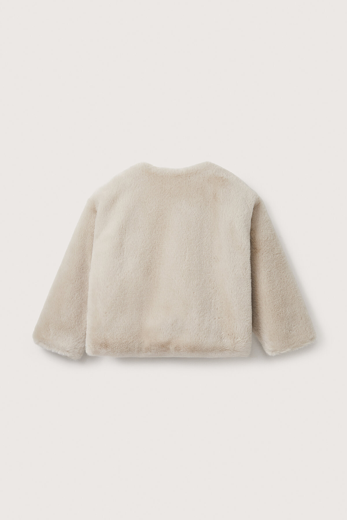 Beige faux fur jacket with a crew neck, pockets, snap button front closure, and cotton lining