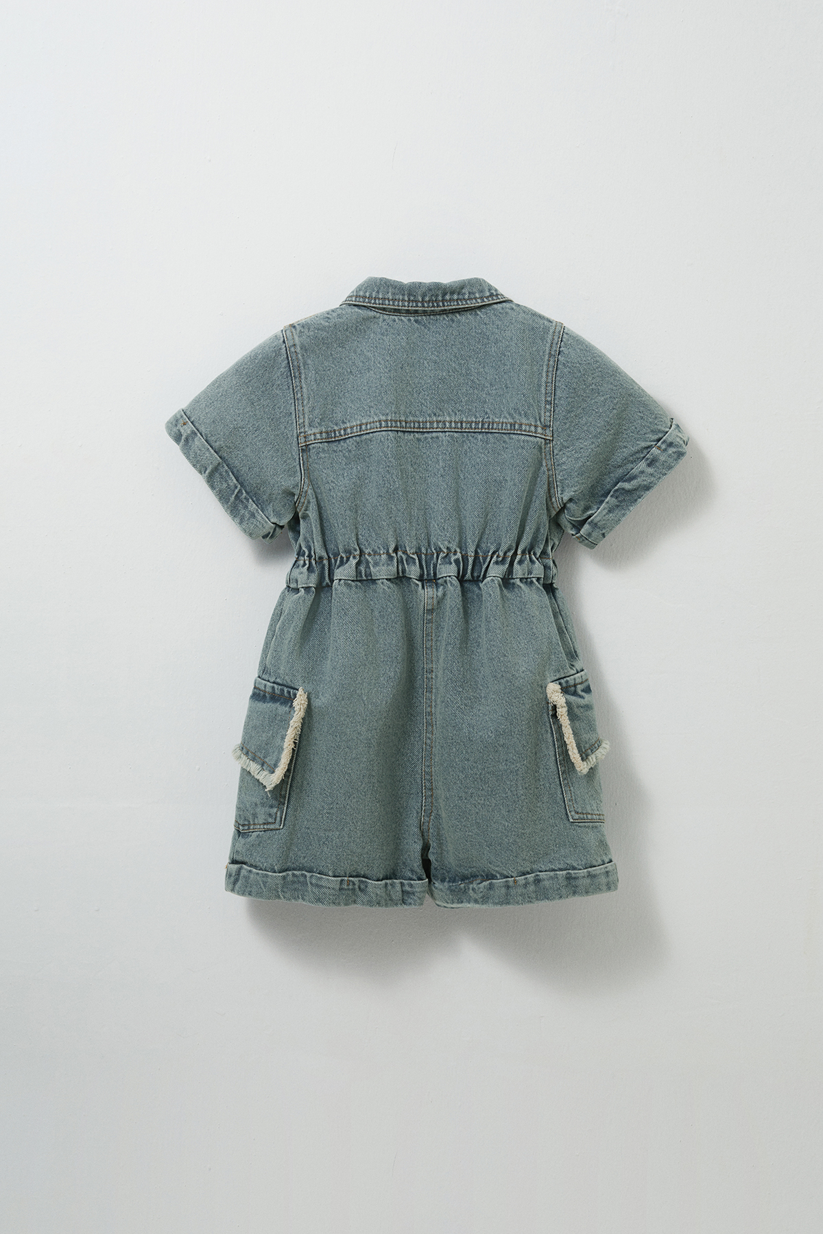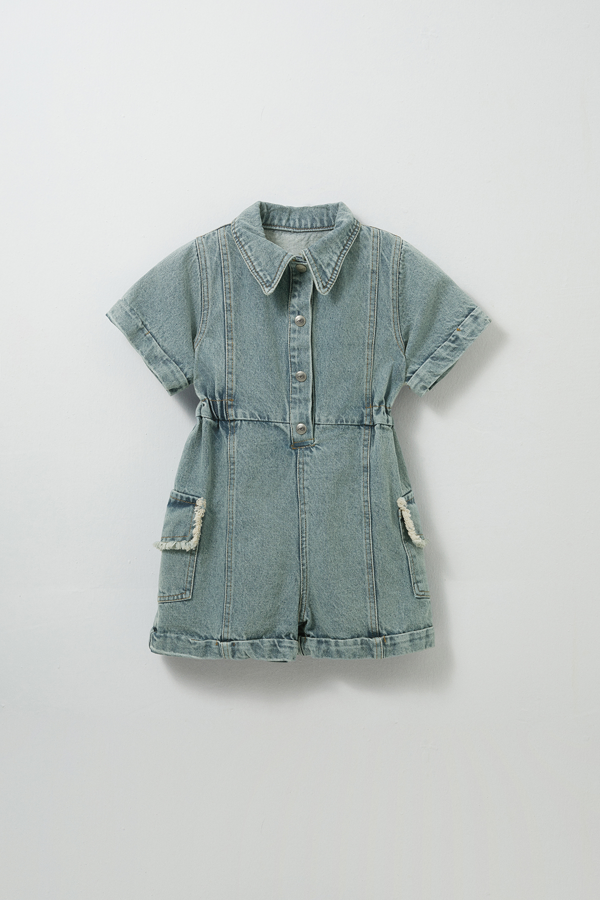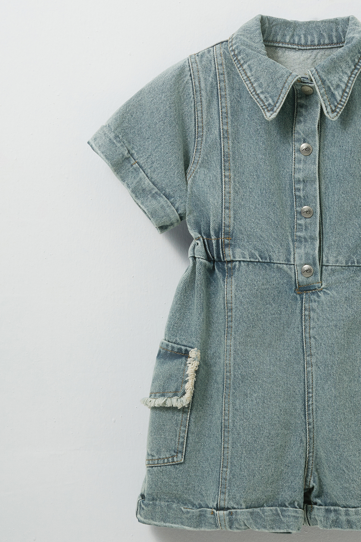 Gelince Haber VerGömlek yaka, kısa kollu, önden düğmeli, kargo cepli, duble paça, beli lastikli, pamuk denim kumaş, kısa, unisex çocuk, tulum.