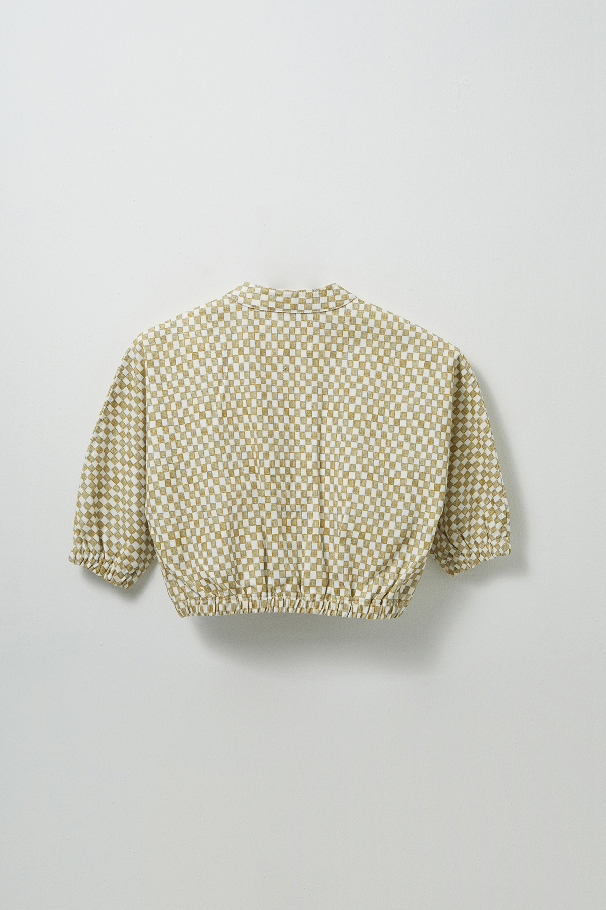 Gelince Haber VerAçık yeşil, dama desenli, manşetleri büzgü detaylı, önü çıtçıtlı, pamuk kumaş, unisex, bomber ceket.