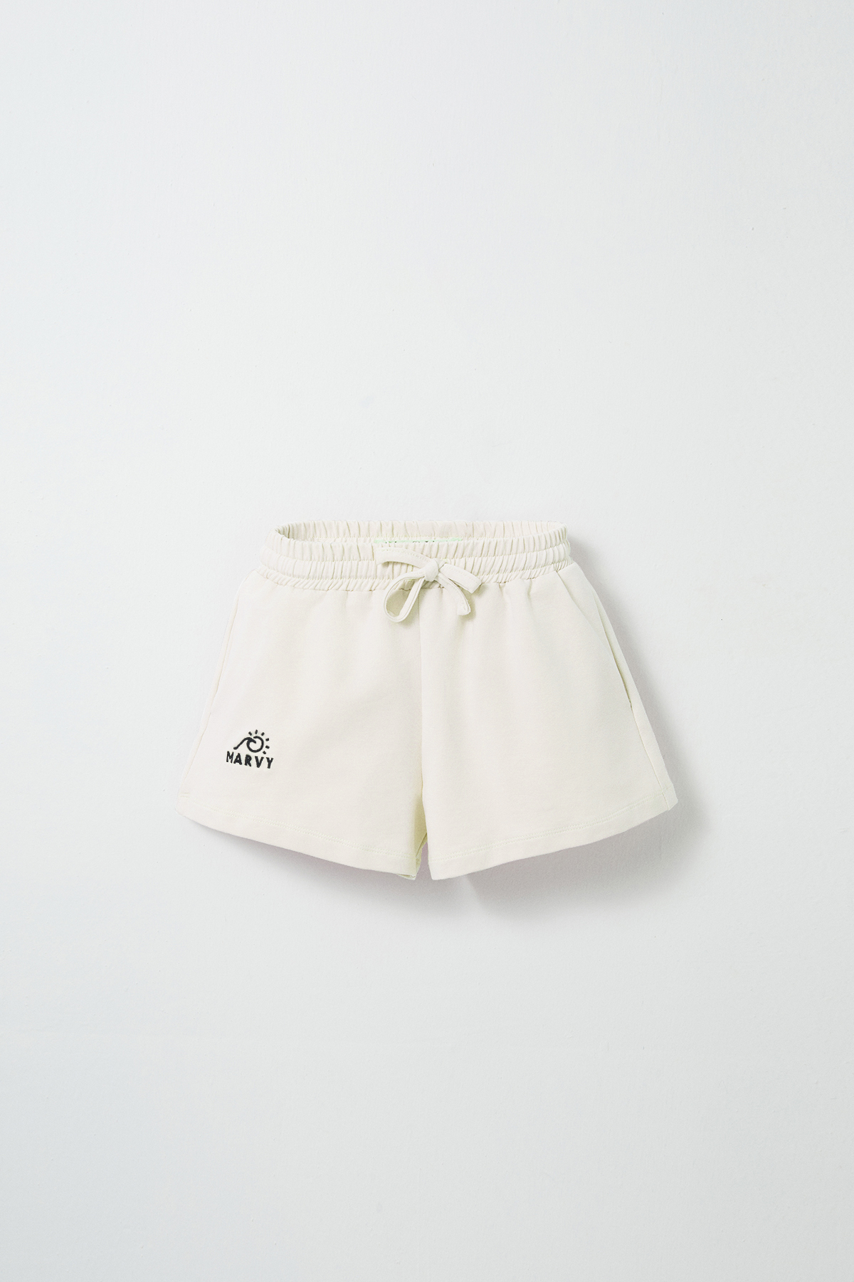 Notify me when its in stockEcru, elastic waistband, drawstring, pockets, embroidery details, stretchy cotton fabric, girls' mini shorts.