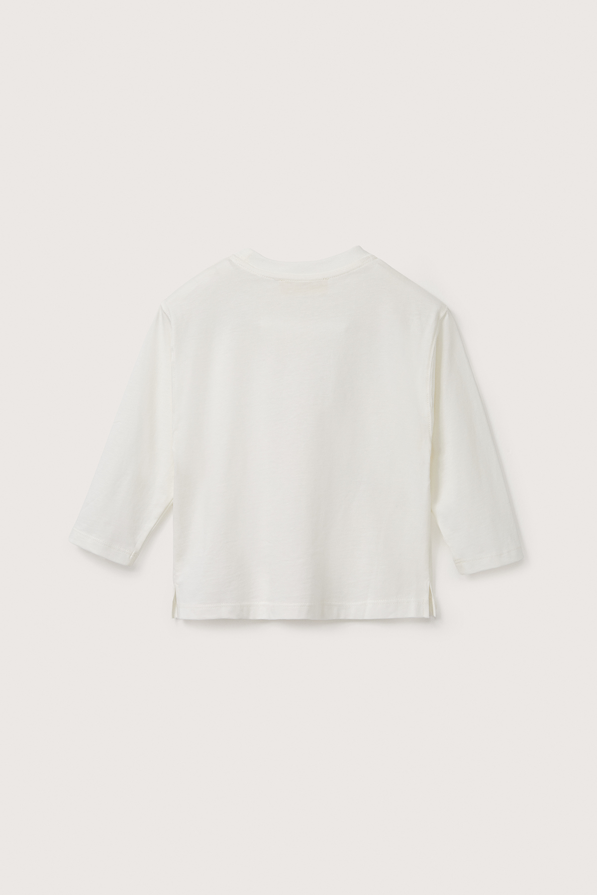 Notify me when its in stockEcru long sleeve kids’ t-shirt with dropped shoulders, crew neck, hem label detail, relaxed fit, stretch cotton fabric