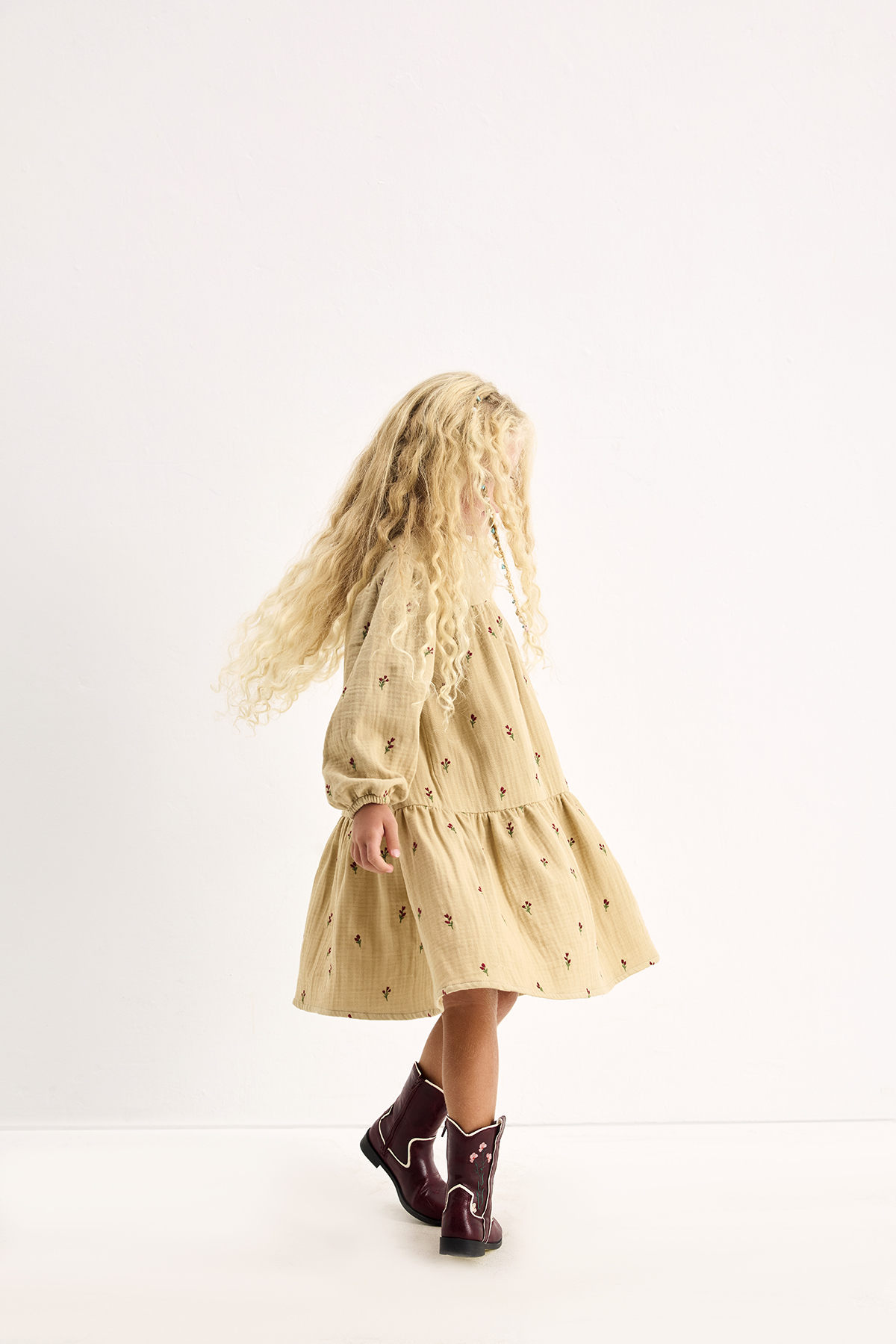Gelince Haber VerBej rengi üzeri bordo çiçek nakışlı uzun kollu bisiklet yaka arkadan düğmeli katlı kloş model midi boy iç yüzeyi müslin pamuk kumaş kız çocuk elbise.