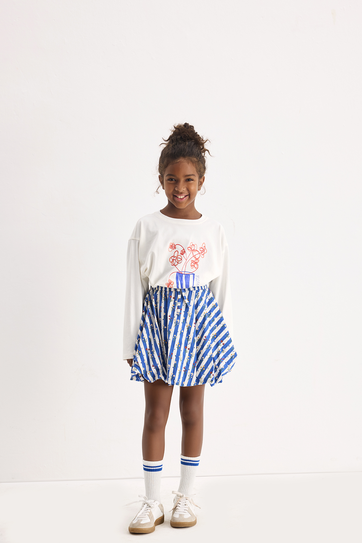 Verev mavi çizgiler üzerinde minik çiçek desenleriyle zarif bir görünüm sunan bu çocuk mini balon etek, modern ve sevimli tasarımıyla öne çıkar. Beli lastikli yapısı sayesinde rahat bir kullanım sağlarken, likralı pamuk kumaşıyla gün boyu konfor ve esneklik sunar. Hafif balon formu eteğe hareketli bir siluet kazandırarak çocuğunuzun günlük kombinlerine enerjik bir hava katar. Hem günlük giyimde hem de özel günlerde kullanılabilecek şık ve kullanışlı bir parçadır.