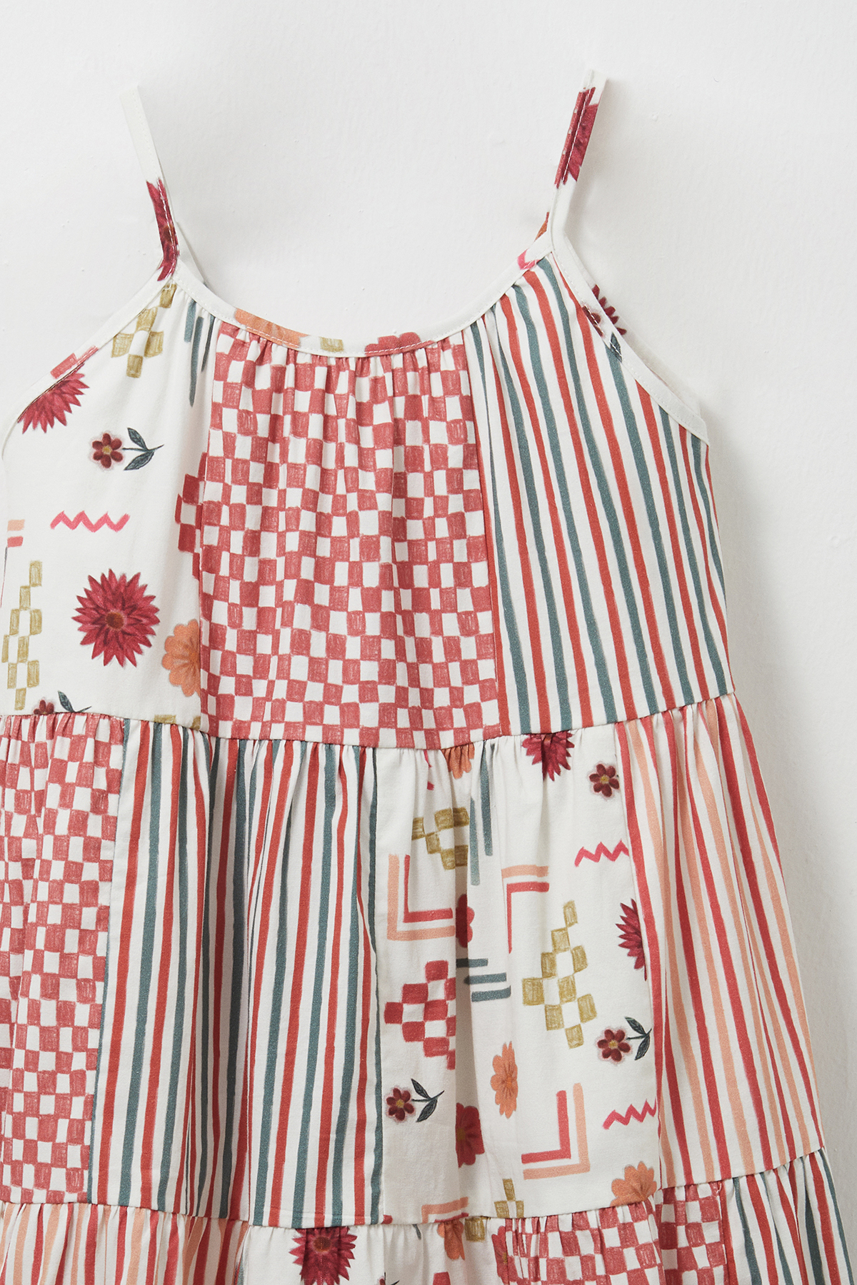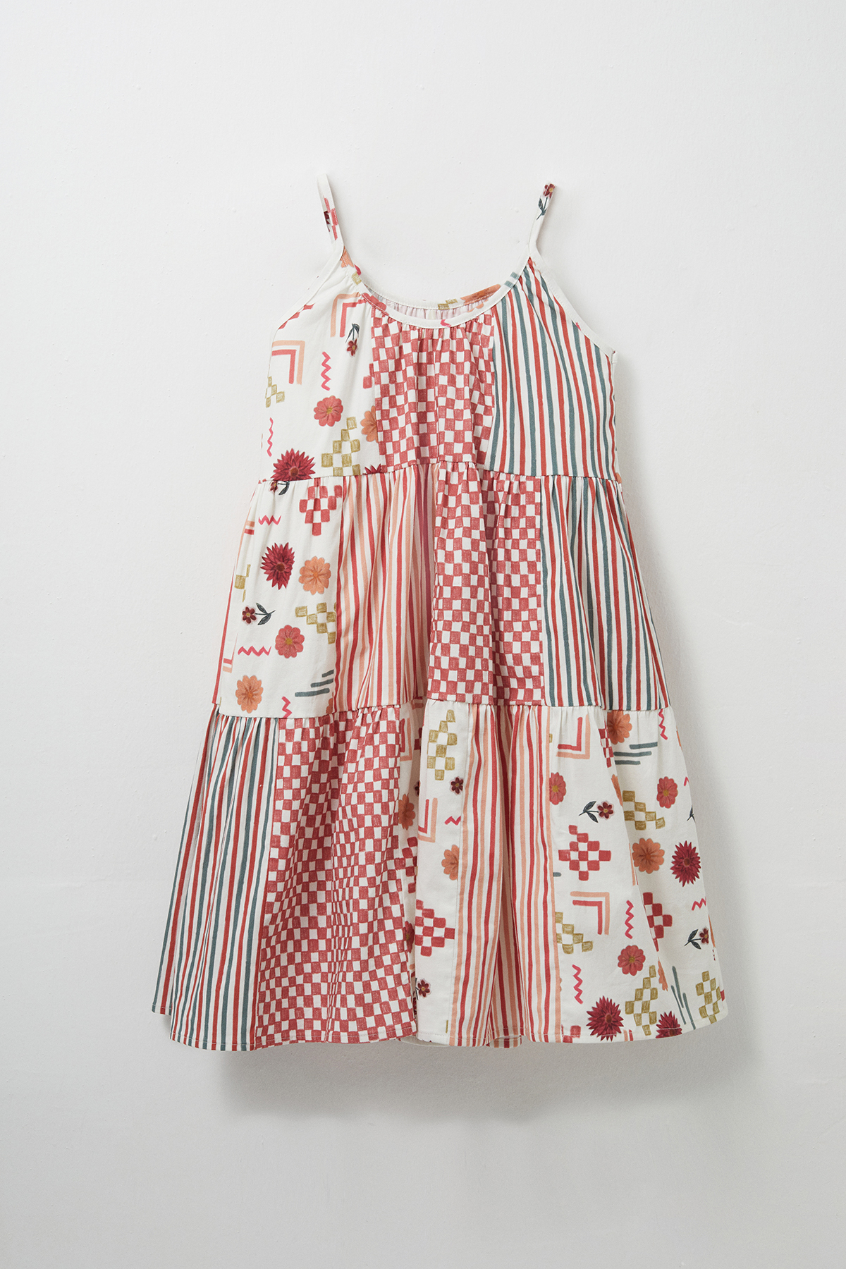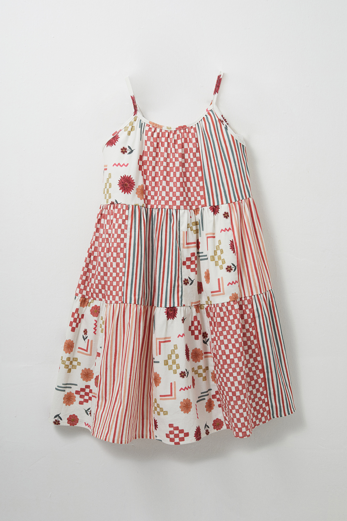 Gelince Haber VerPatch desenli, ip askılı, rahat kesim, katlı model, likralı pamuk kumaş, midi boy, elbise.