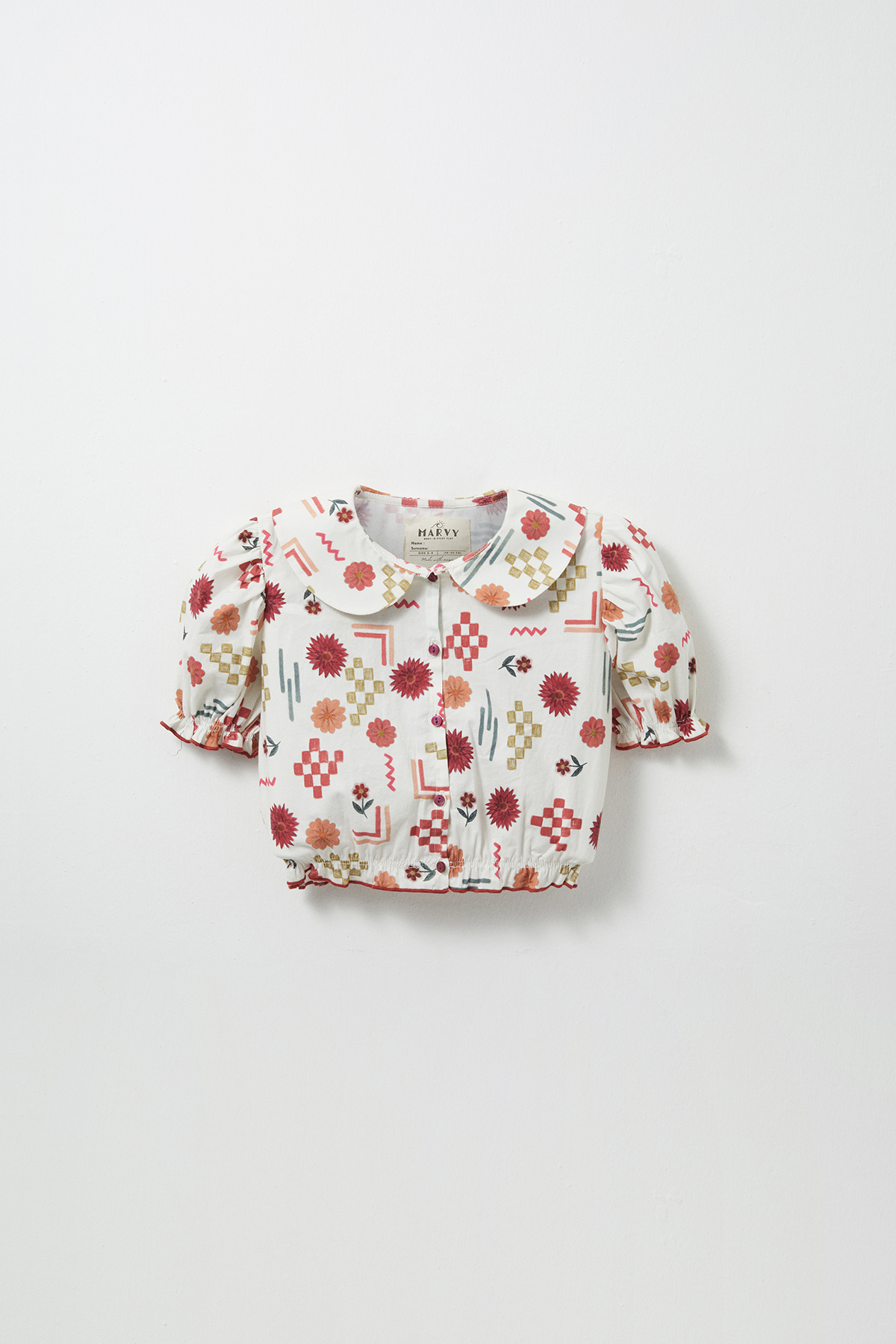 Notify me when its in stockFloral Patterned, Short-Sleeved, Gathered Sleeve, Baby Overlock Hem, Peter Pan Collar, Front-Buttoned, Stretch Cotton Shirt