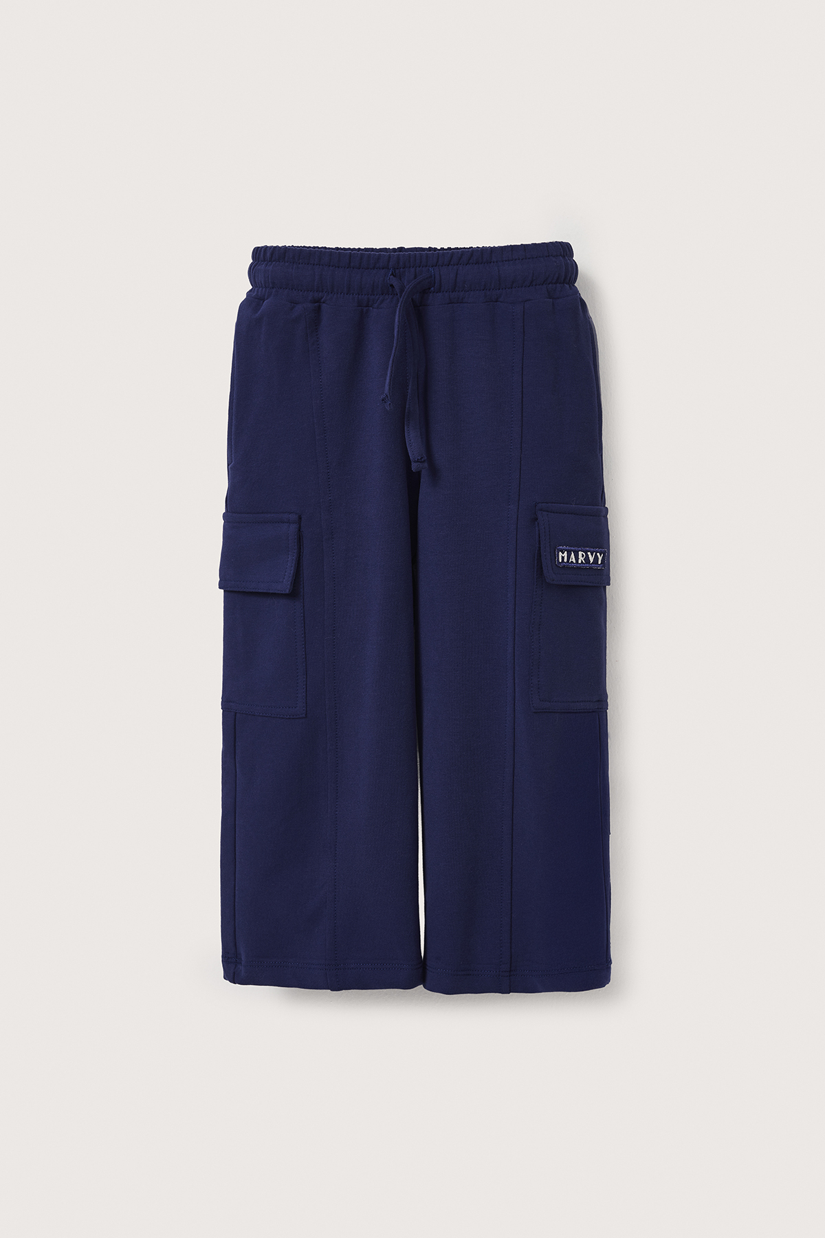 Gelince Haber VerLacivert kargo cepli beli lastikli bağlama detaylı cep kapağı nakışlı önden dikişli geniş kesim likralı pamuk kumaştan çocuk pantolon.