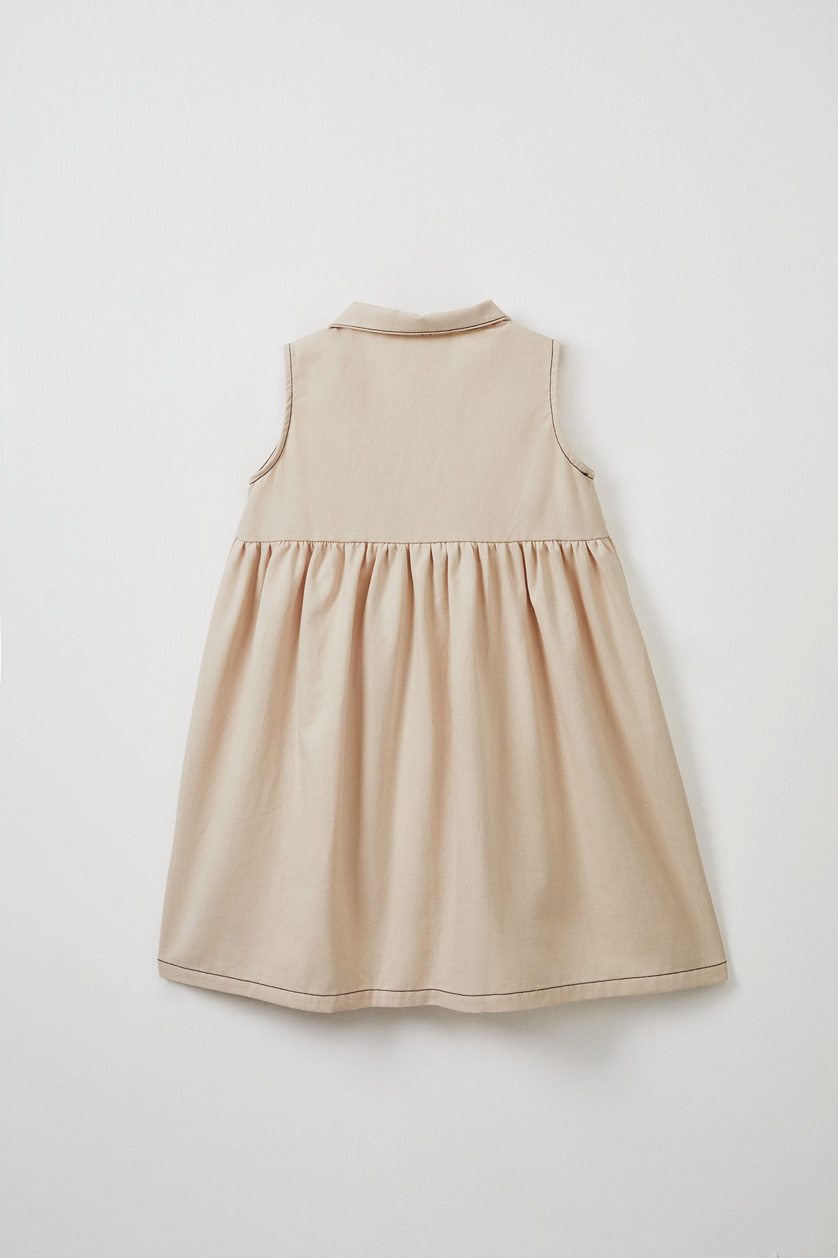 Gelince Haber VerKrem rengi kolsuz yakalı önden düğmeli logo nakış detaylı robadan kloş pamuk gabardin kumaş midi boy kız çocuk elbise.