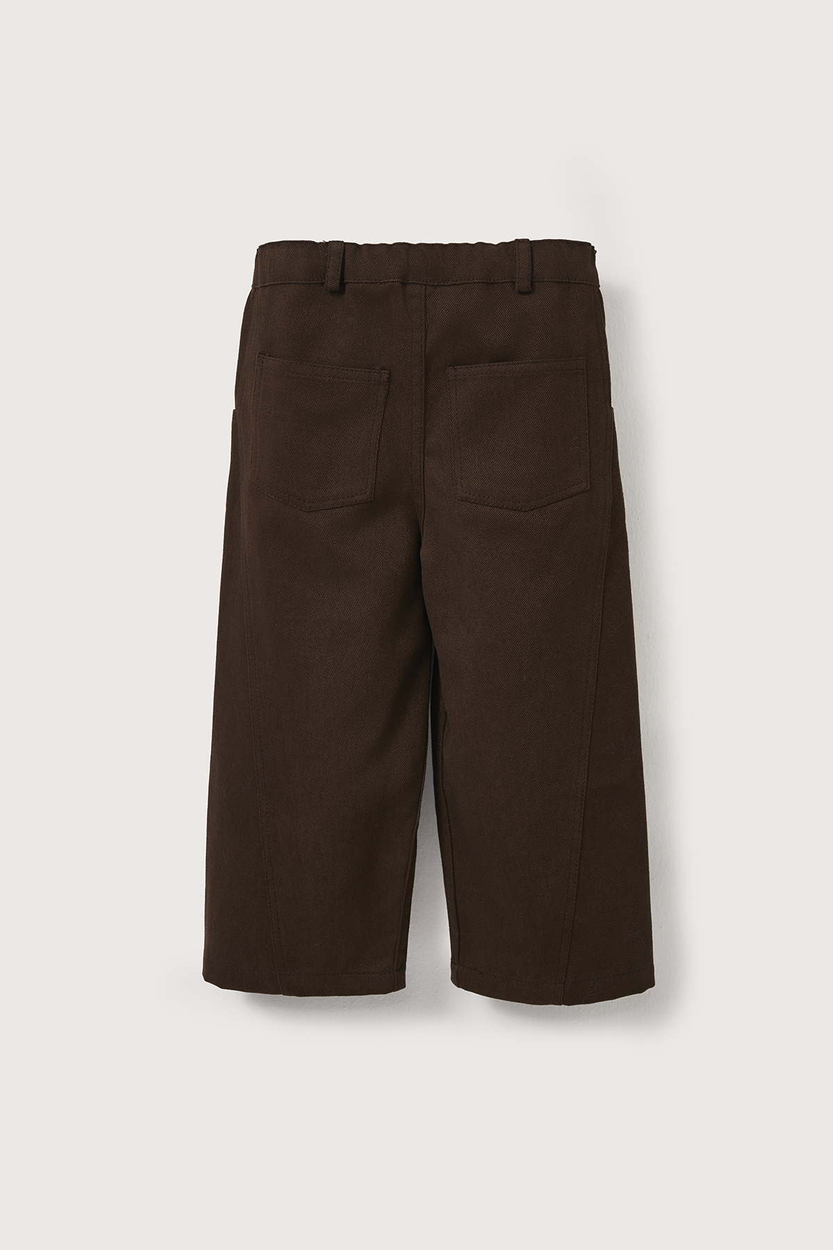 Notify me when its in stockBrown elastic waistband wide-leg children’s trousers with belt loops, diagonal topstitch details, and pockets, made of cotton fabric.