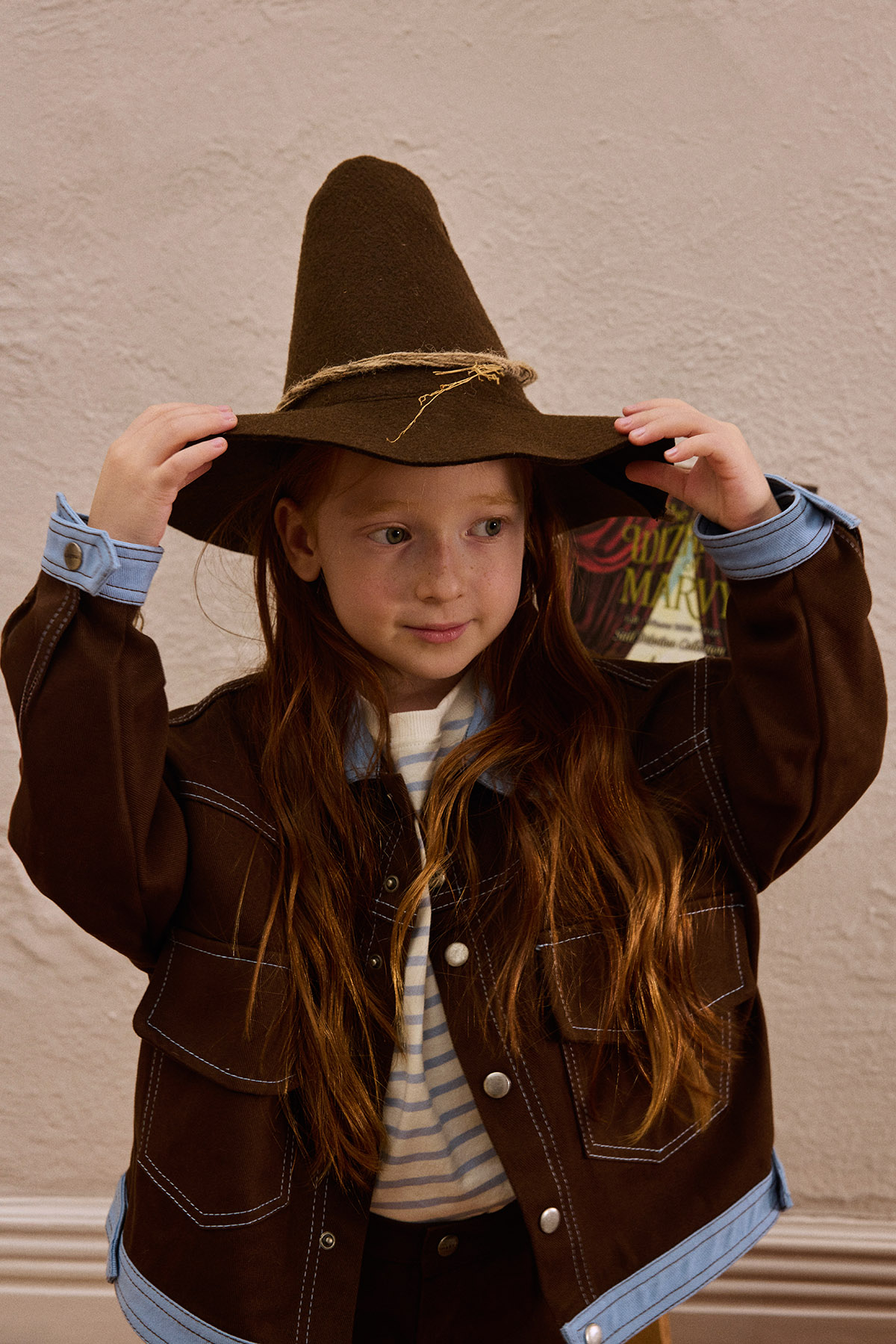 This children’s jacket in a brown and blue color combination stands out with its modern and dynamic design. Featuring a shirt collar and snap button closure at the front, it offers both practicality and style. The patch pockets add functionality, while the contrast topstitching enhances the overall sporty yet chic look. Crafted from 100% cotton fabric, it ensures breathability, durability, and all-day comfort. Perfect for daily wear and special occasions, this jacket combines functionality with timeless style for kids.