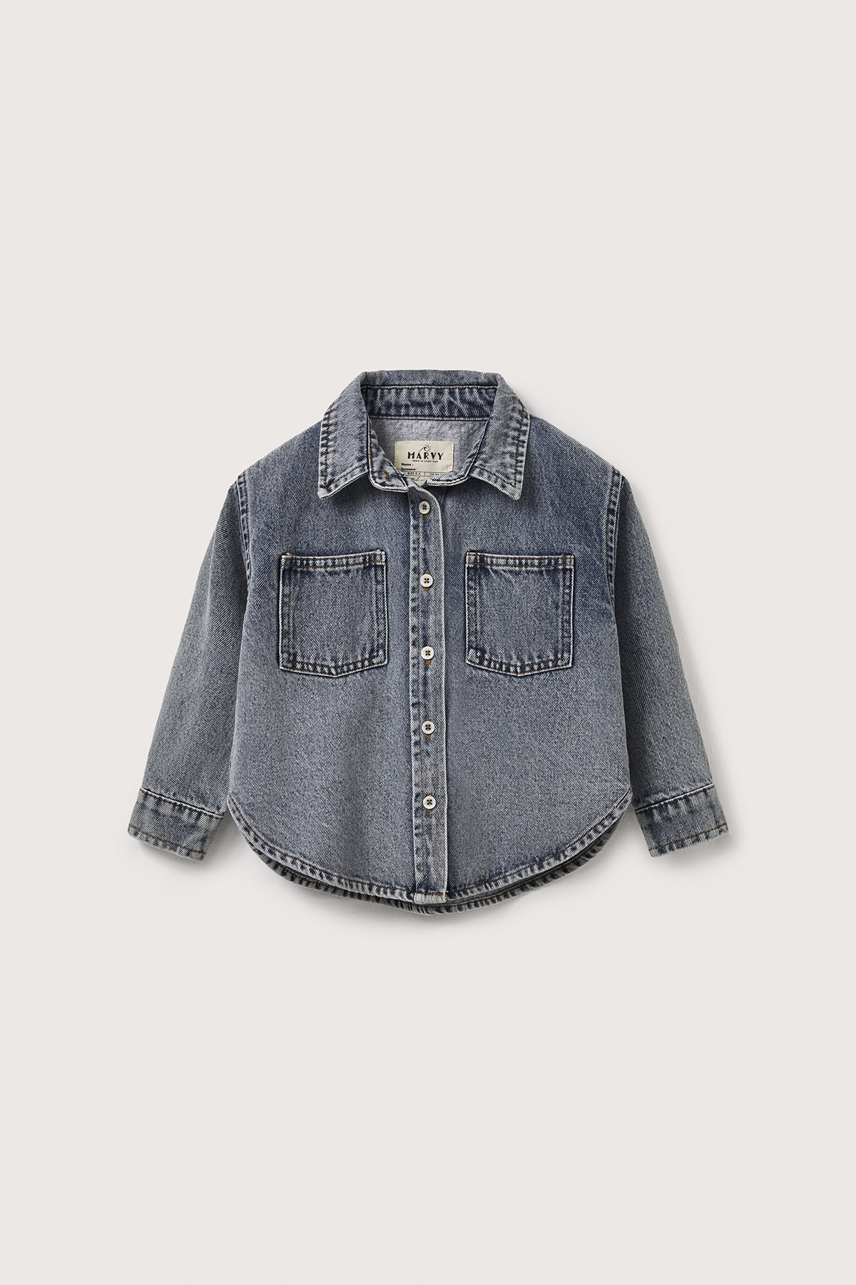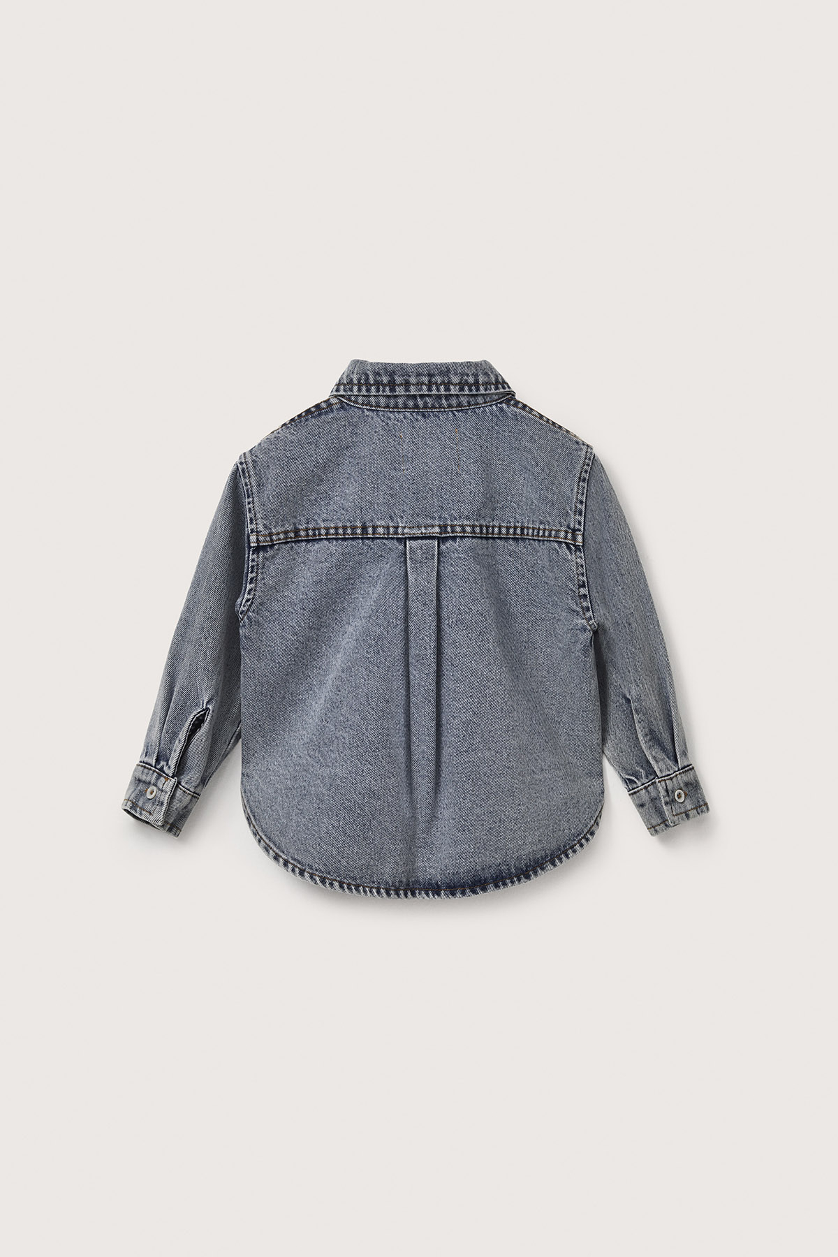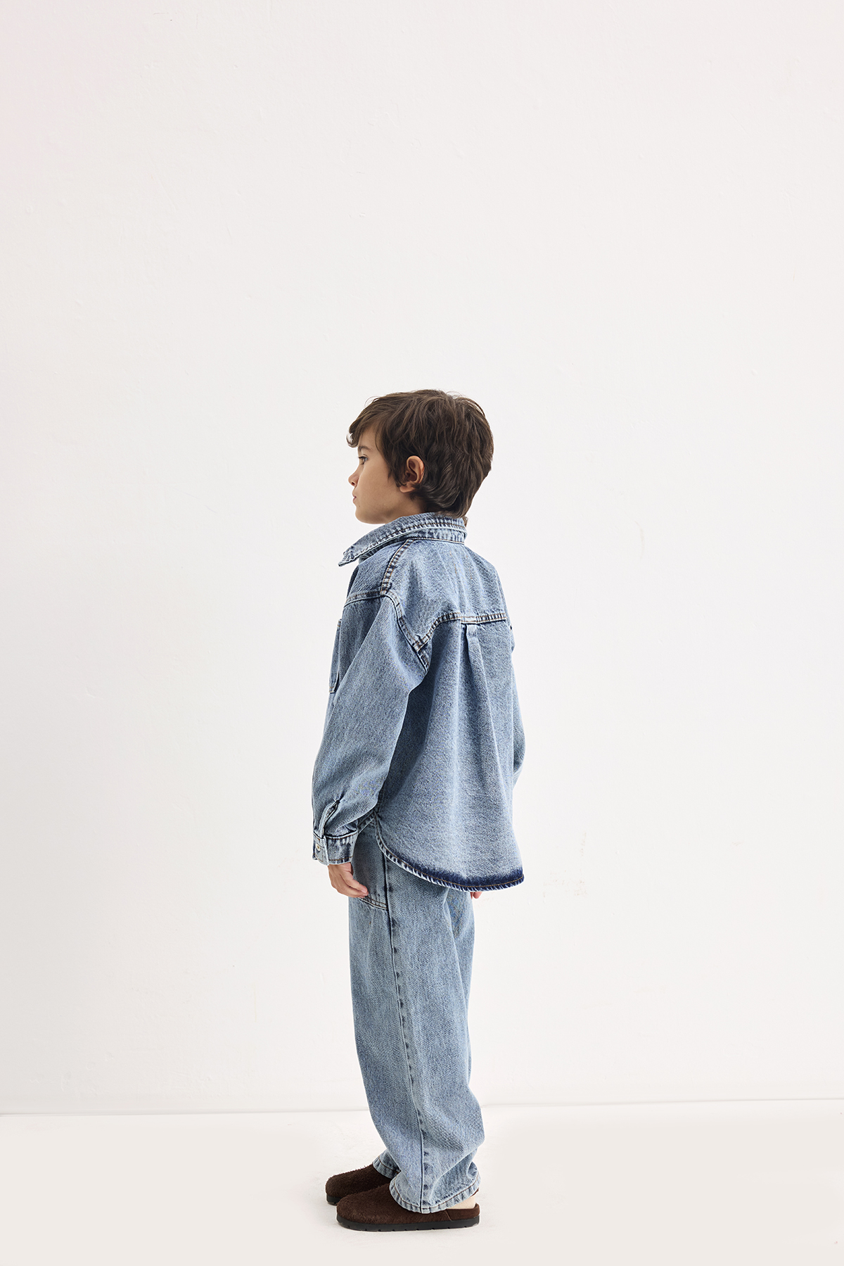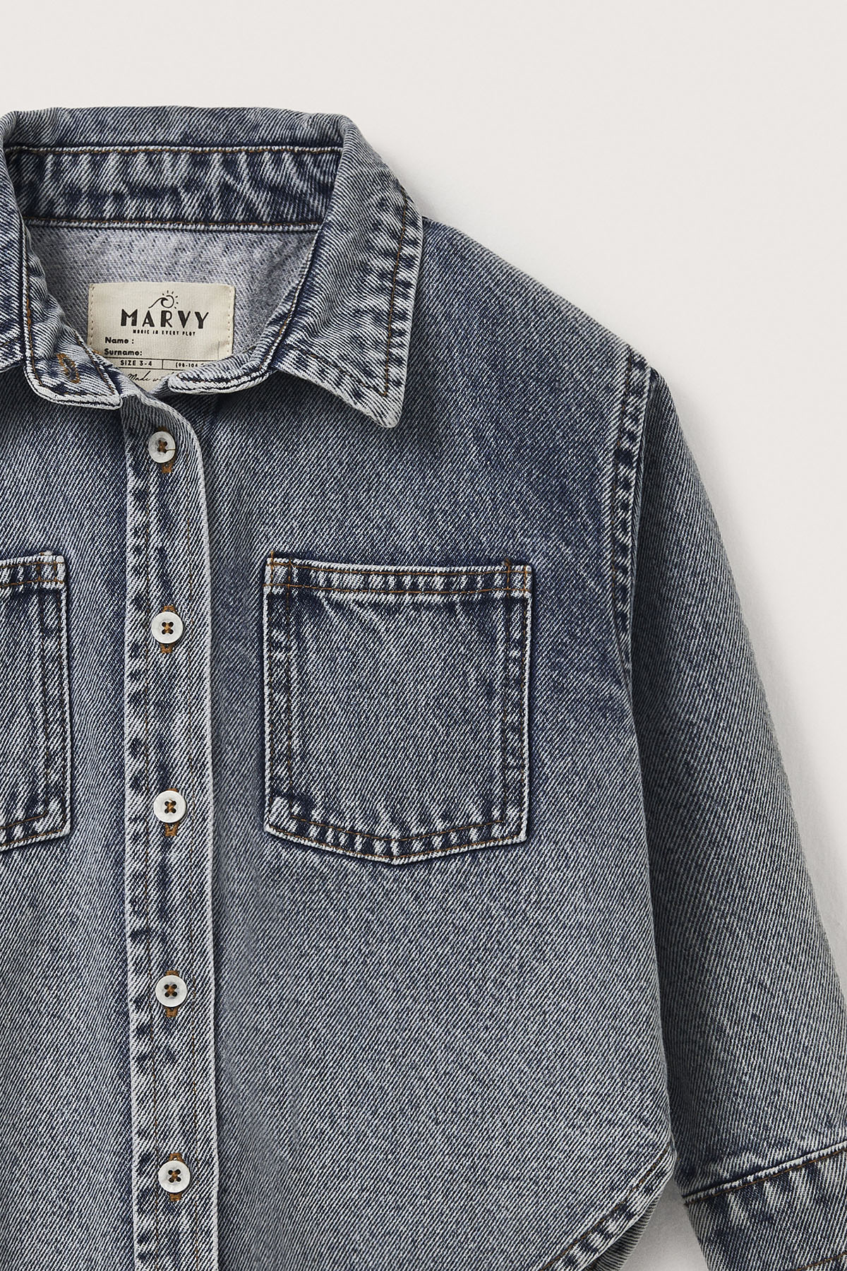 Gelince Haber VerAçık mavi önü cepli pamuk denim kumaştan geniş kesim çocuk gömlek.