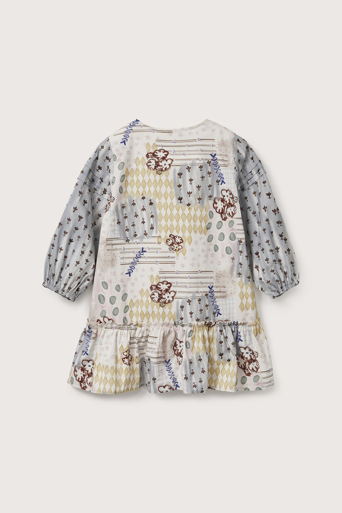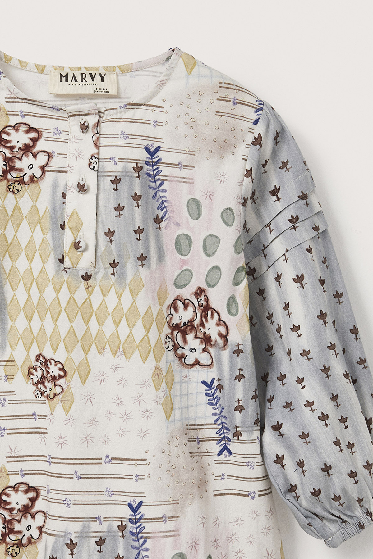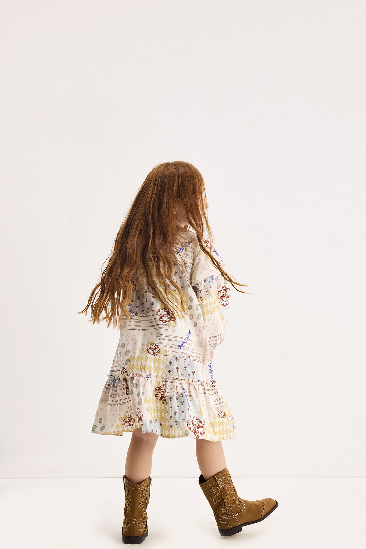 Featuring energetic patch patterns and a flared skirt, this midi dress provides children with both style and comfort. The crew neck and long sleeves with elastic cuffs offer freedom of movement, while the front button detail allows practical use. Its stretch cotton fabric is soft, flexible, and breathable, ensuring all-day comfort.