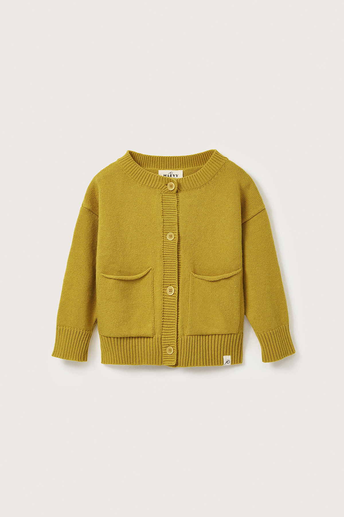 Combining comfort and elegance, this yellow cardigan features a crew neck and front button closure for a timeless look, while patch pockets and a hem label detail add a modern touch. The ribbed cuffs enhance comfort, and its relaxed fit allows kids to move freely throughout the day. Made from a luxurious cashmere blend knitted fabric, it offers softness, breathability, and warmth, making it perfect for both daily wear and special occasions.