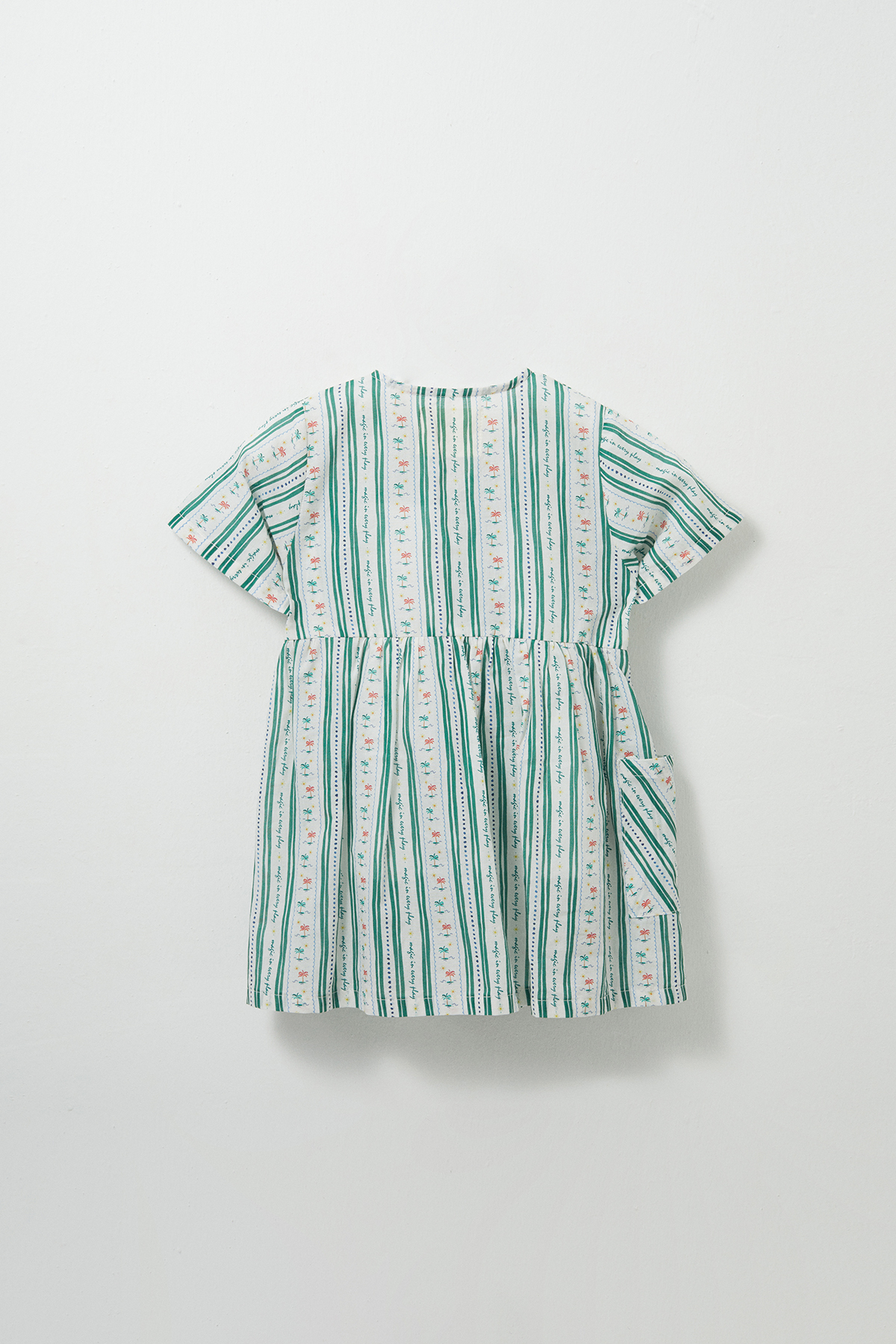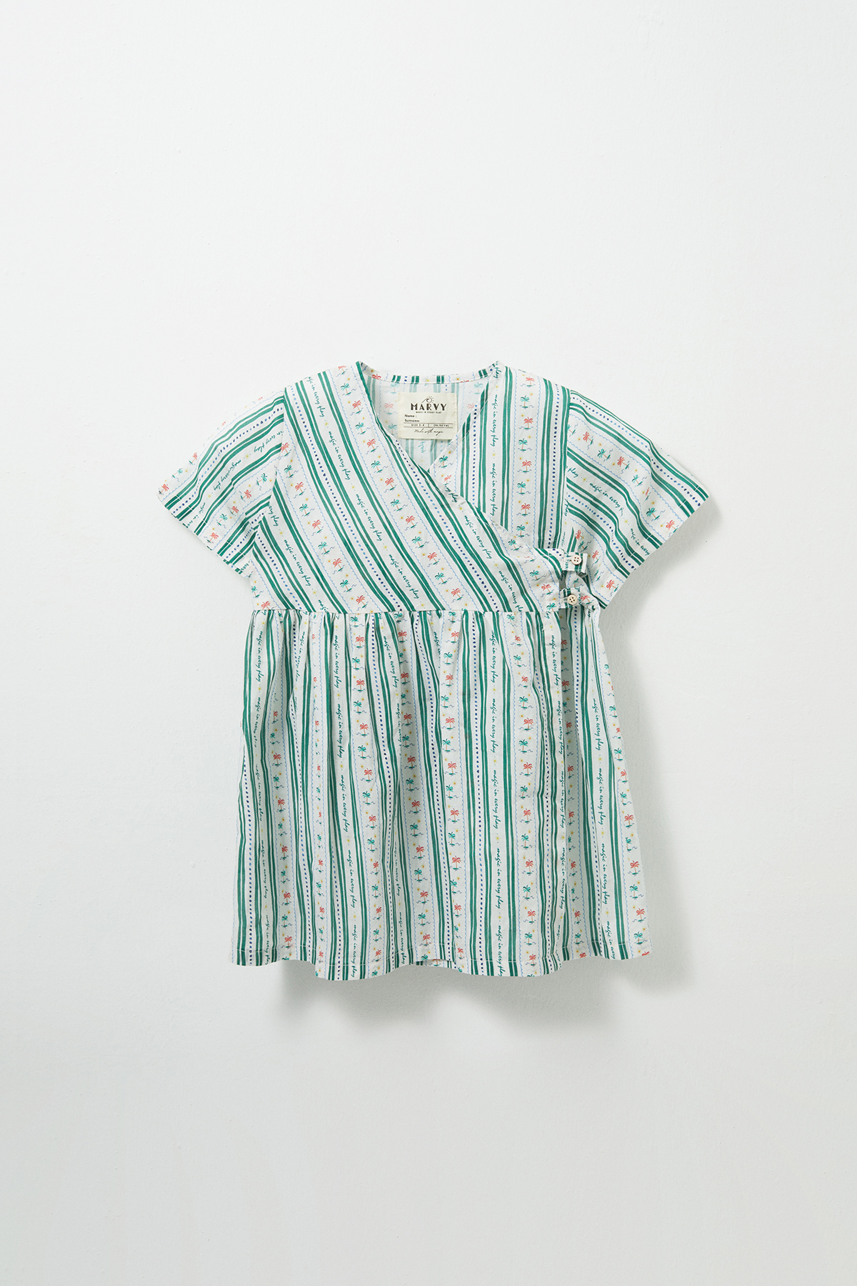 Gelince Haber VerYeşil tropik-çizgi desenli, kruvaze yaka, yandan düğmeli, kısa kollu, cep detaylı, kloş, pamuk vual kumaş, kısa elbise.