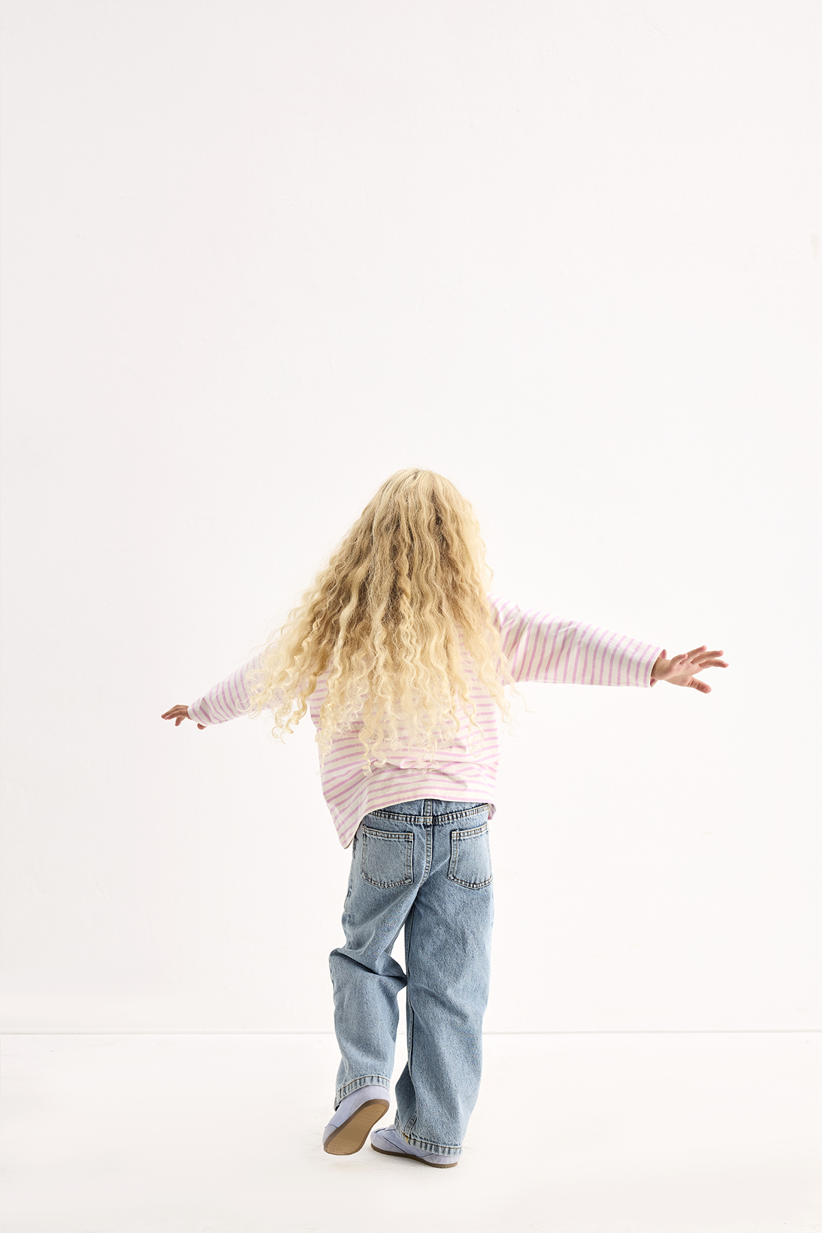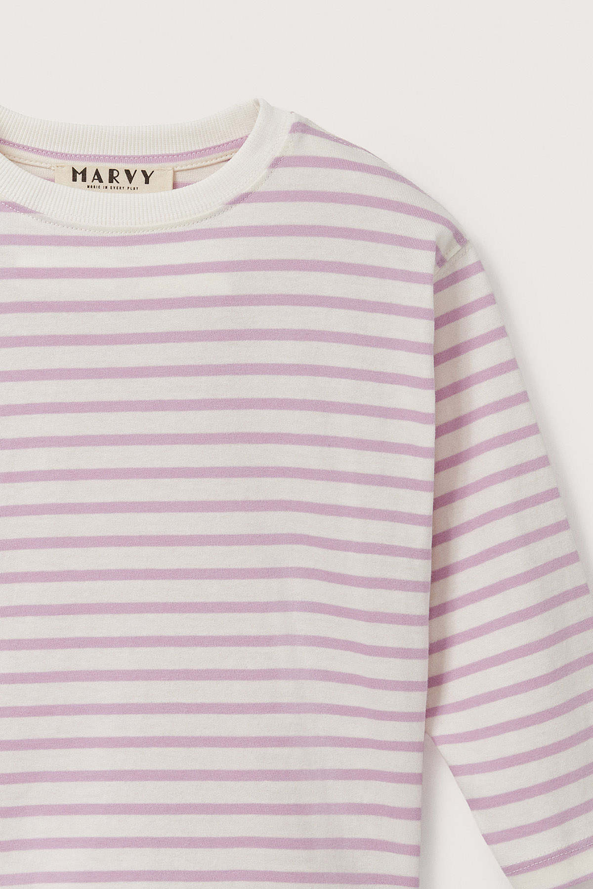 Gelince Haber VerBeyaz pembe çizgili uzun kollu bisiklet yaka eteği tırnak etiket detaylı geniş kesim %100 pamuk kumaştan çocuk tişört.