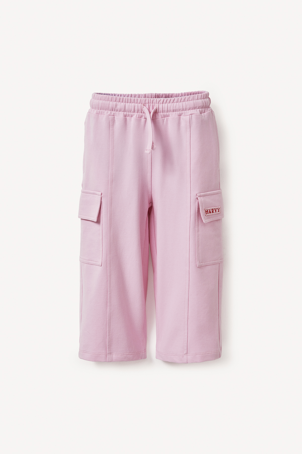 Gelince Haber VerAçık pembe kargo cepli beli lastikli bağlama detaylı cep kapağı nakışlı önden dikişli geniş kesim likralı pamuk kumaştan çocuk pantolon.