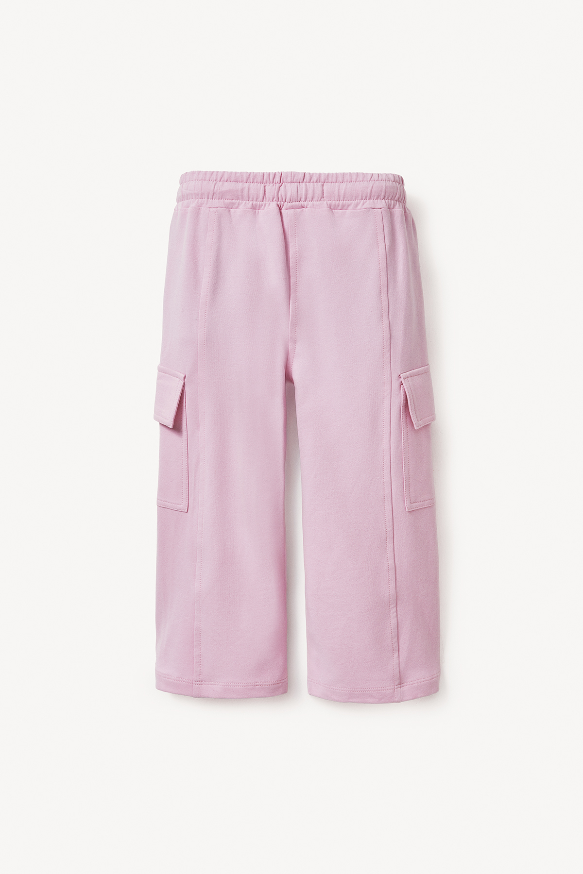 Notify me when its in stockLight pink kids’ pants with cargo pockets, elastic waistband with tie detail, embroidered pocket flap, front seam, relaxed fit, stretch cotton fabric