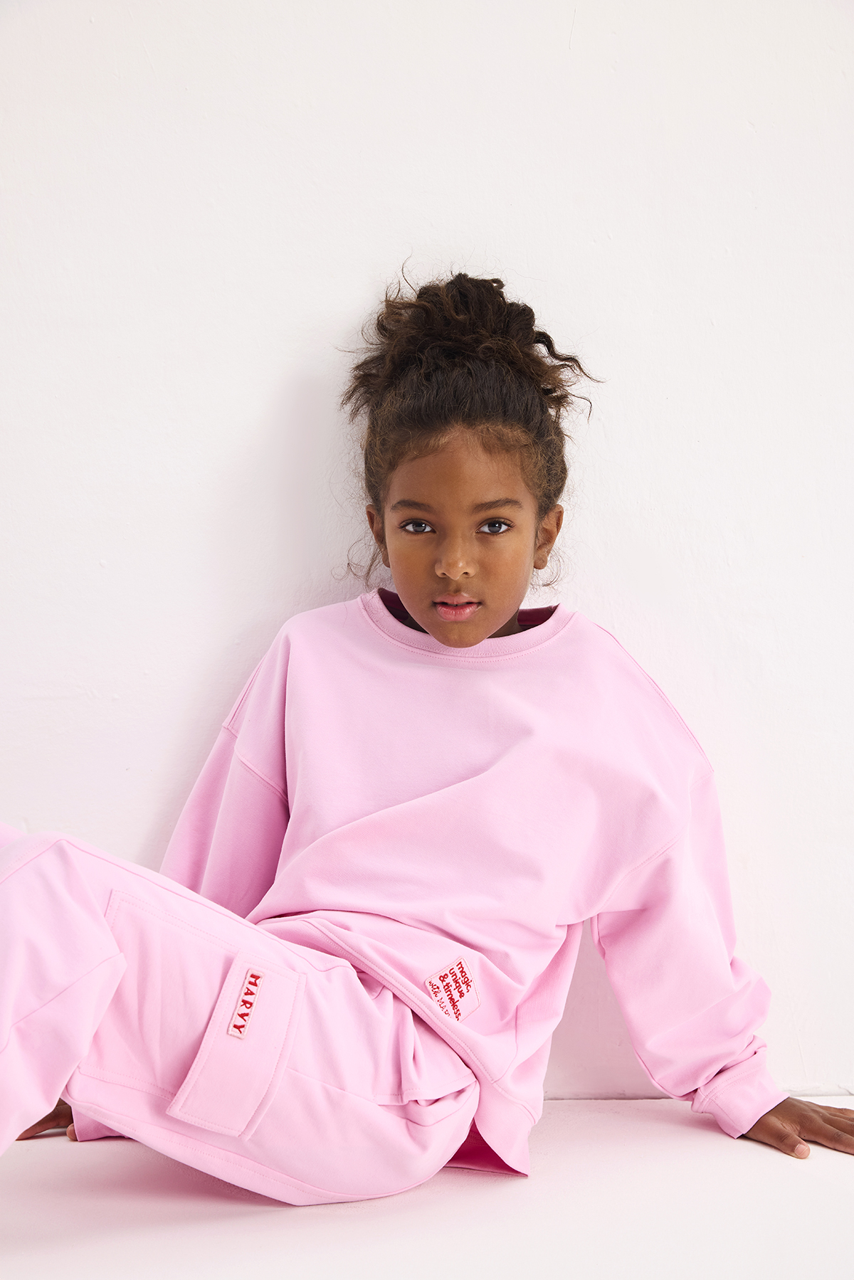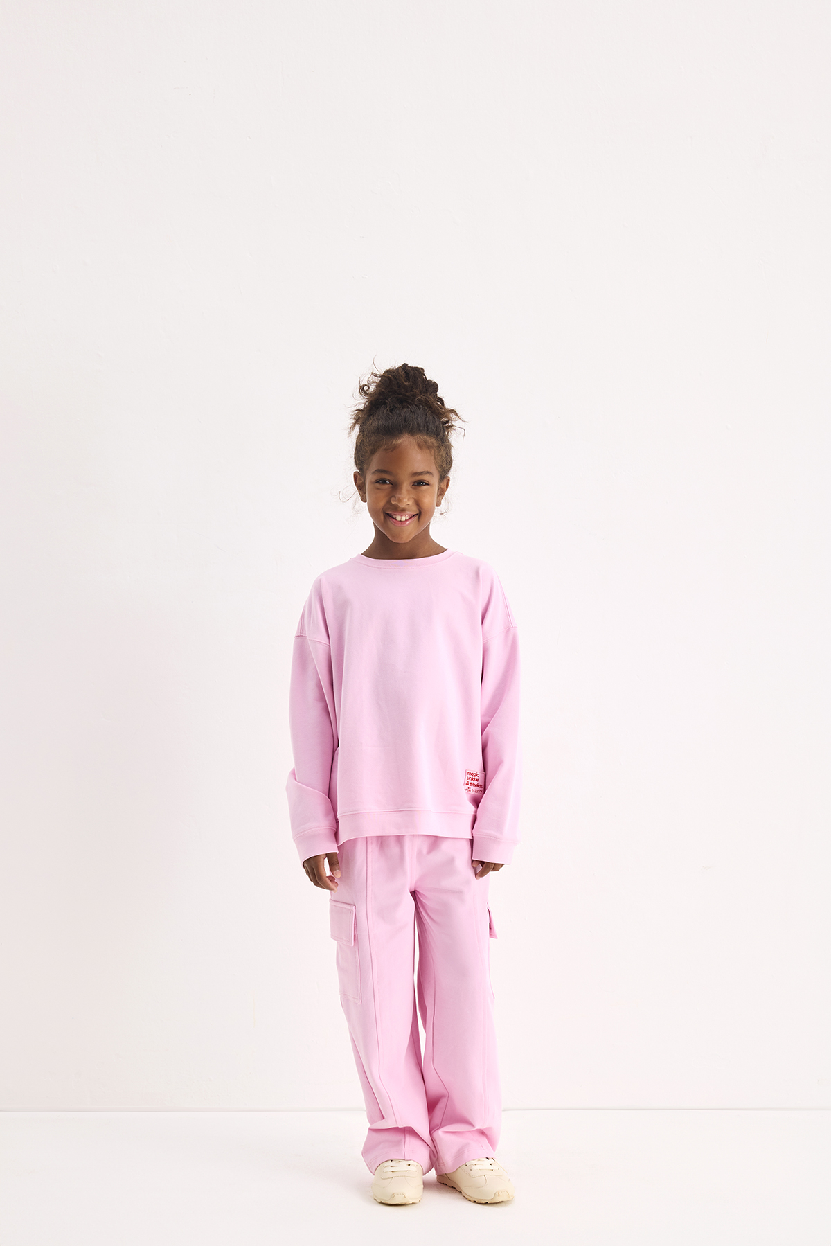 Notify me when its in stockLight pink long sleeve crew neck kids’ sweatshirt with dropped shoulders, embroidery detail, relaxed fit, stretch cotton fabric