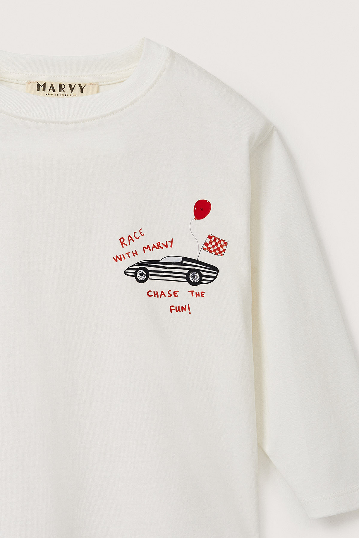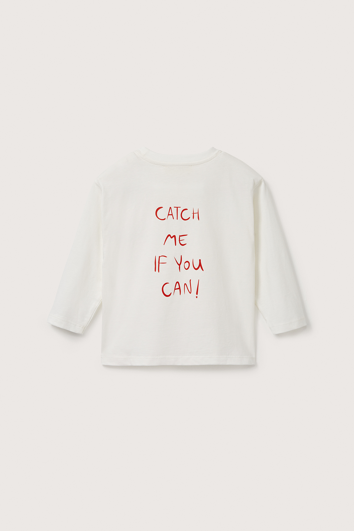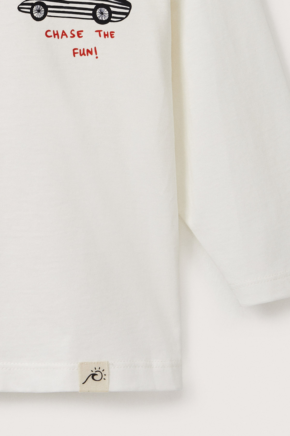 Notify me when its in stockWhite long sleeve crew neck boys’ t-shirt with digital print on the front and back, hem label detail, relaxed fit, 100% cotton fabric