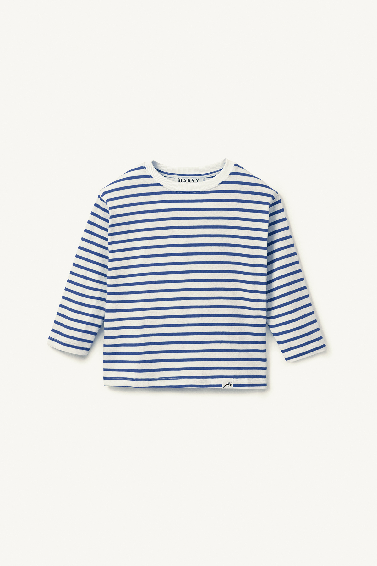 Gelince Haber VerBeyaz saks çizgili uzun kollu bisiklet yaka eteği tırnak etiket detaylı geniş kesim %100 pamuk kumaştan çocuk tişört.