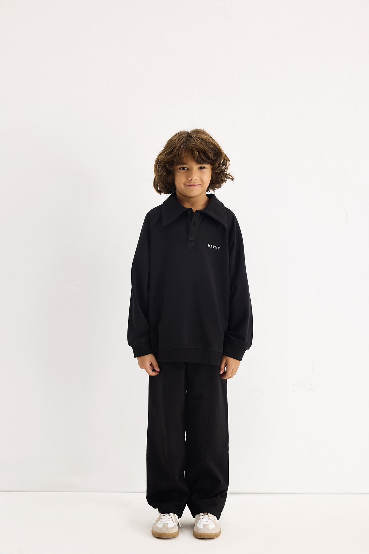 Gelince Haber VerSiyah, cepli, beli lastikli, ip bağlamalı, nakışlı, önden dikiş detaylı, rahat kesim, likralı pamuk kumaş, unisex çocuk pantolon-eşofman.
