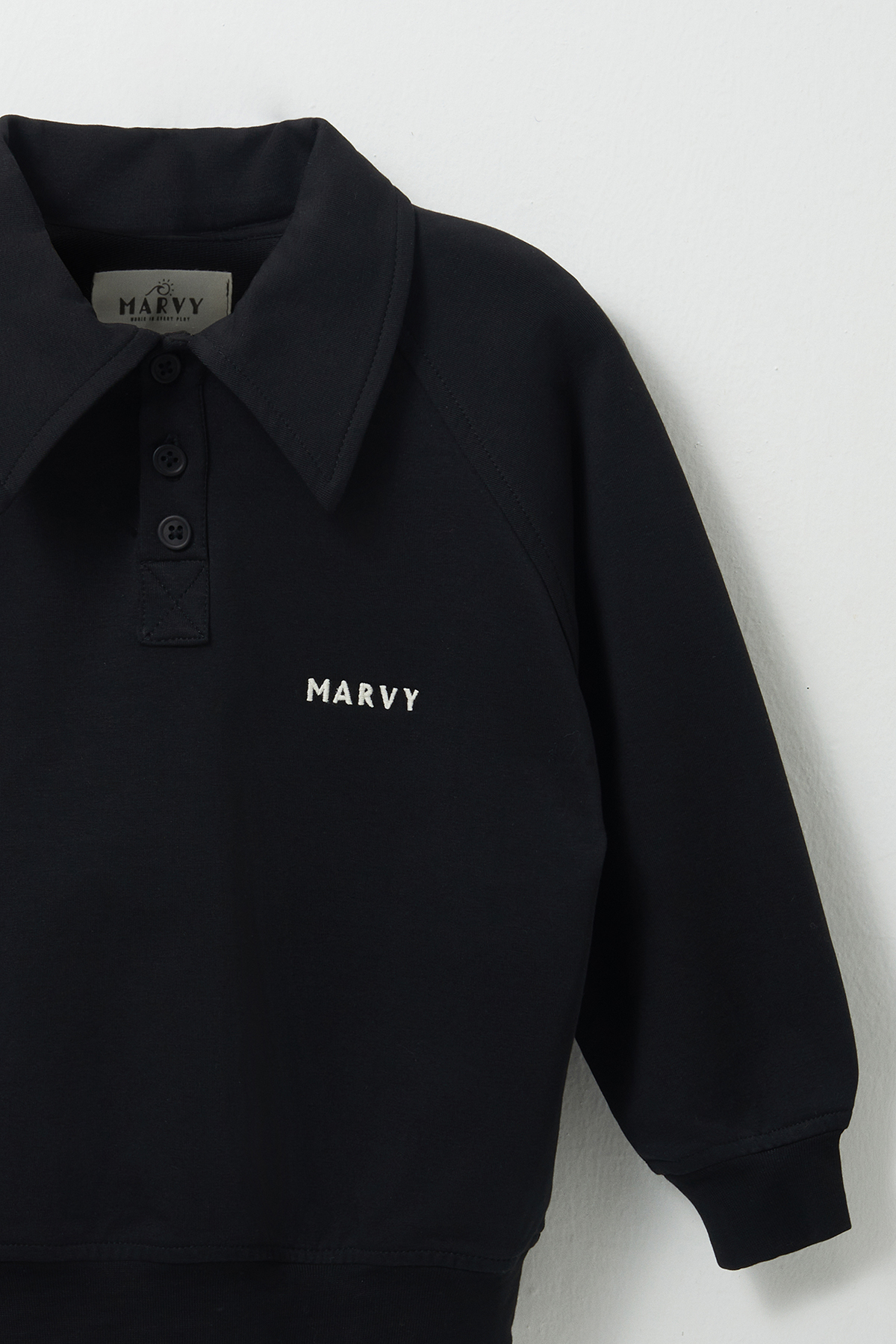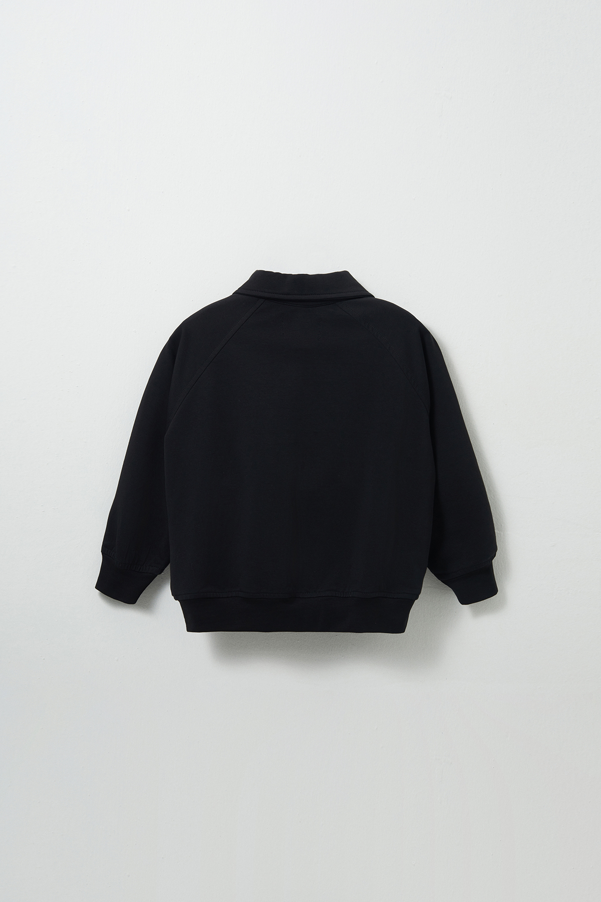 Gelince Haber VerSiyah, reglan kollu, polo yaka, geniş kesim, nakış detaylı, likralı pamuk kumaş, unisex çocuk sweatshirt.