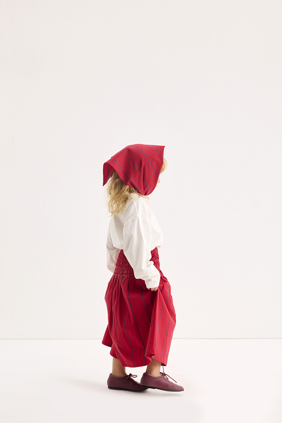 Kırmızı çizgili kloş midi boy etek, enerjik ve şık tasarımıyla öne çıkıyor. Basen kısmındaki gipeli yapısı sayesinde çocuğunuzun vücuduna rahatça uyum sağlarken, yanlardaki bağlama detayları modern ve sevimli bir görünüm sunar. Likralı pamuk kumaşıyla esnek, yumuşak ve nefes alabilen bu etek, gün boyu konfor sağlar. Kombinlere kolayca uyum sağlayan bu model, hem günlük kullanımda hem de özel günlerde çocuklar için ideal bir tercihtir.
