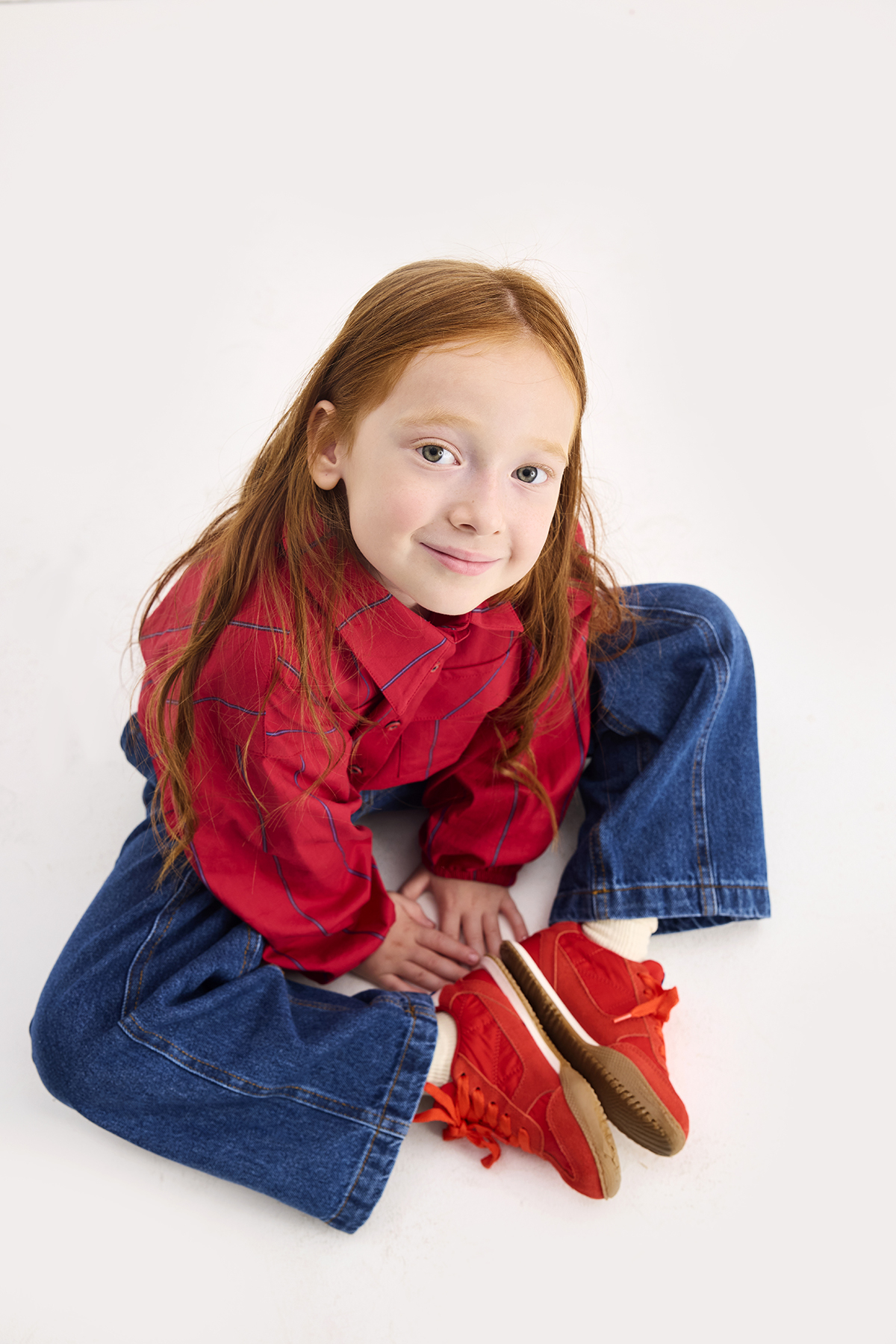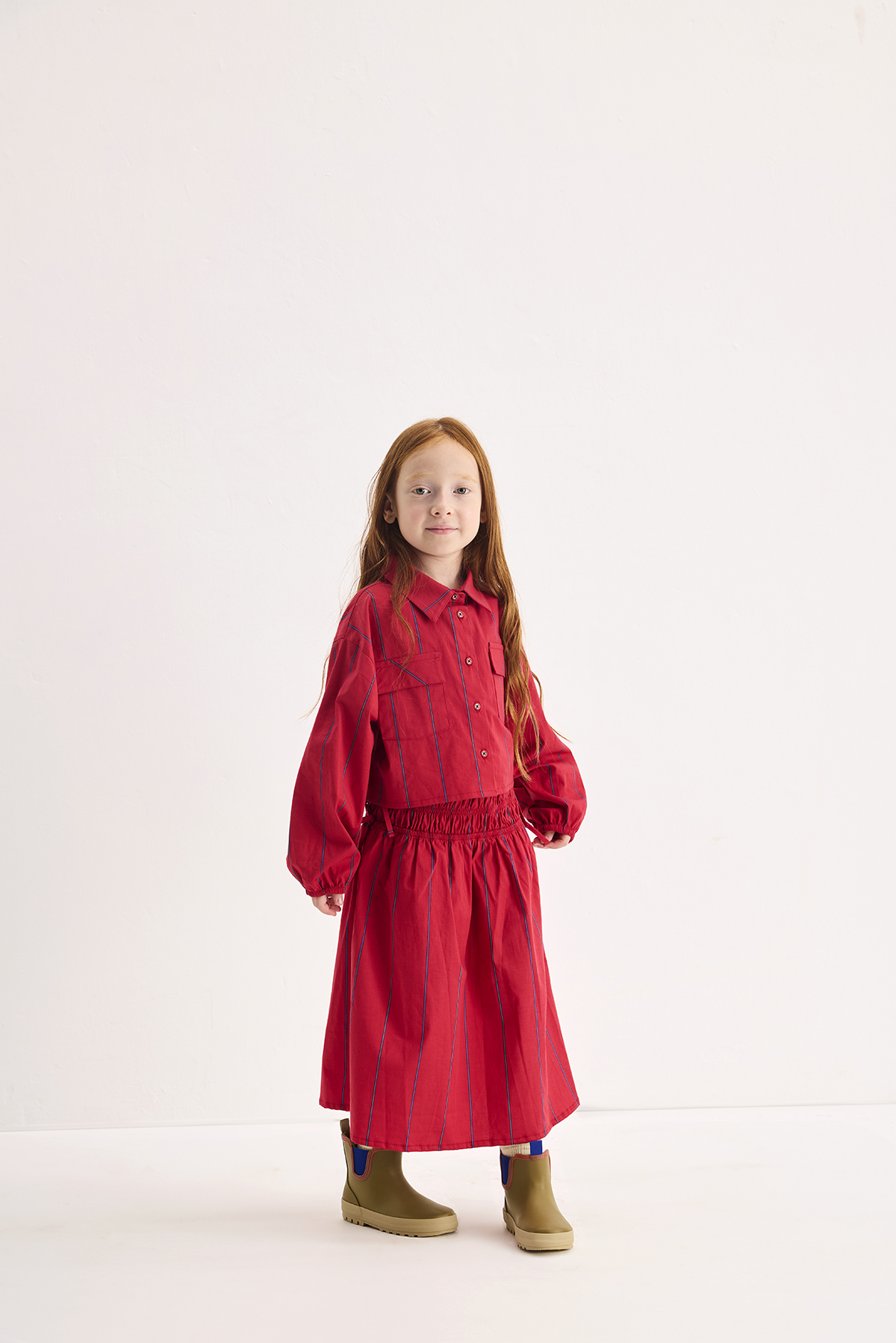 This red striped girls’ mini shirt brings a stylish and playful look with its modern design. Crafted from stretch cotton fabric, it offers comfort and flexibility, while the elasticated cuffs ensure ease of movement. The front flap pockets add both functionality and a chic detail, making it perfect for everyday wear. A versatile piece that brings a lively touch to any child’s wardrobe.