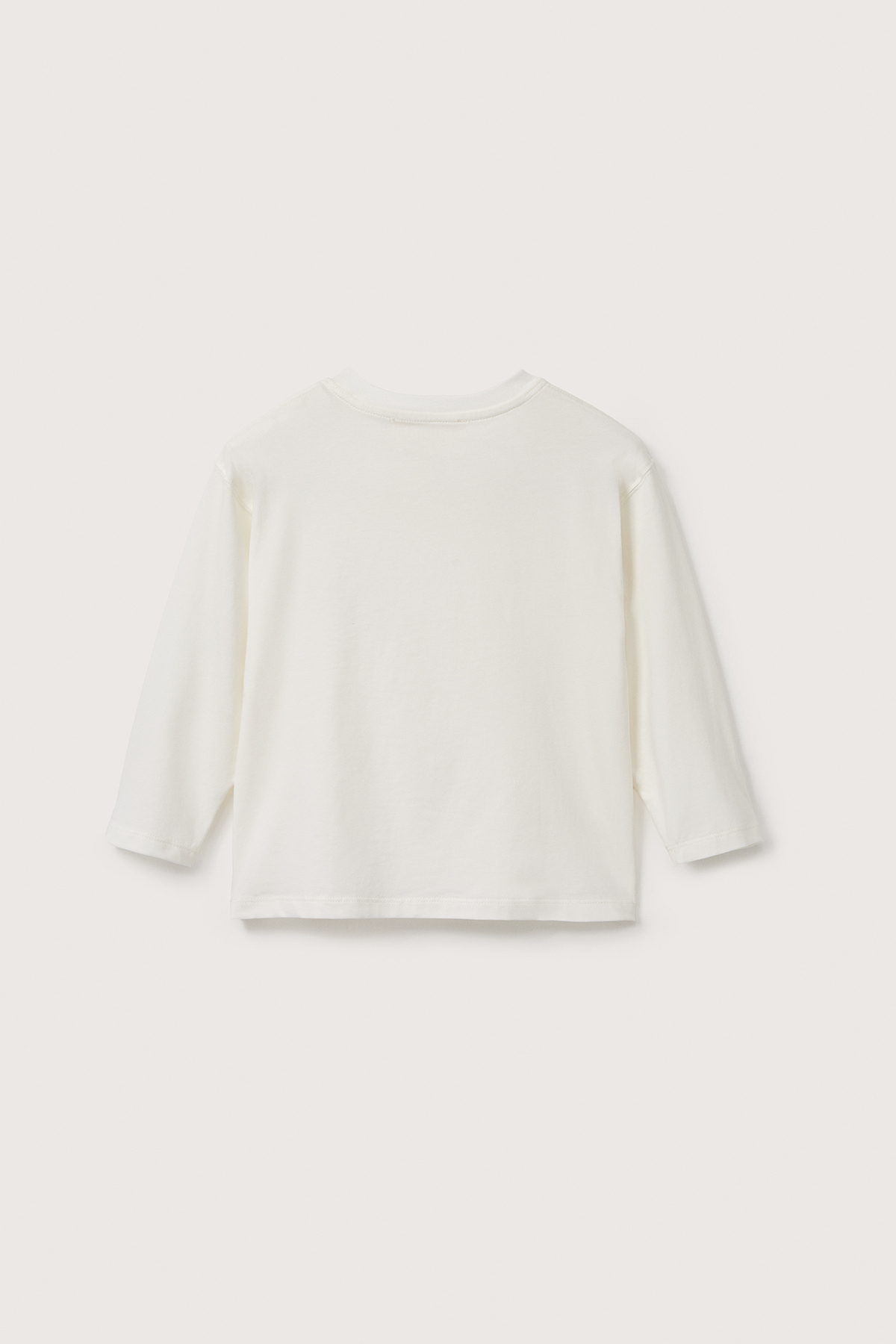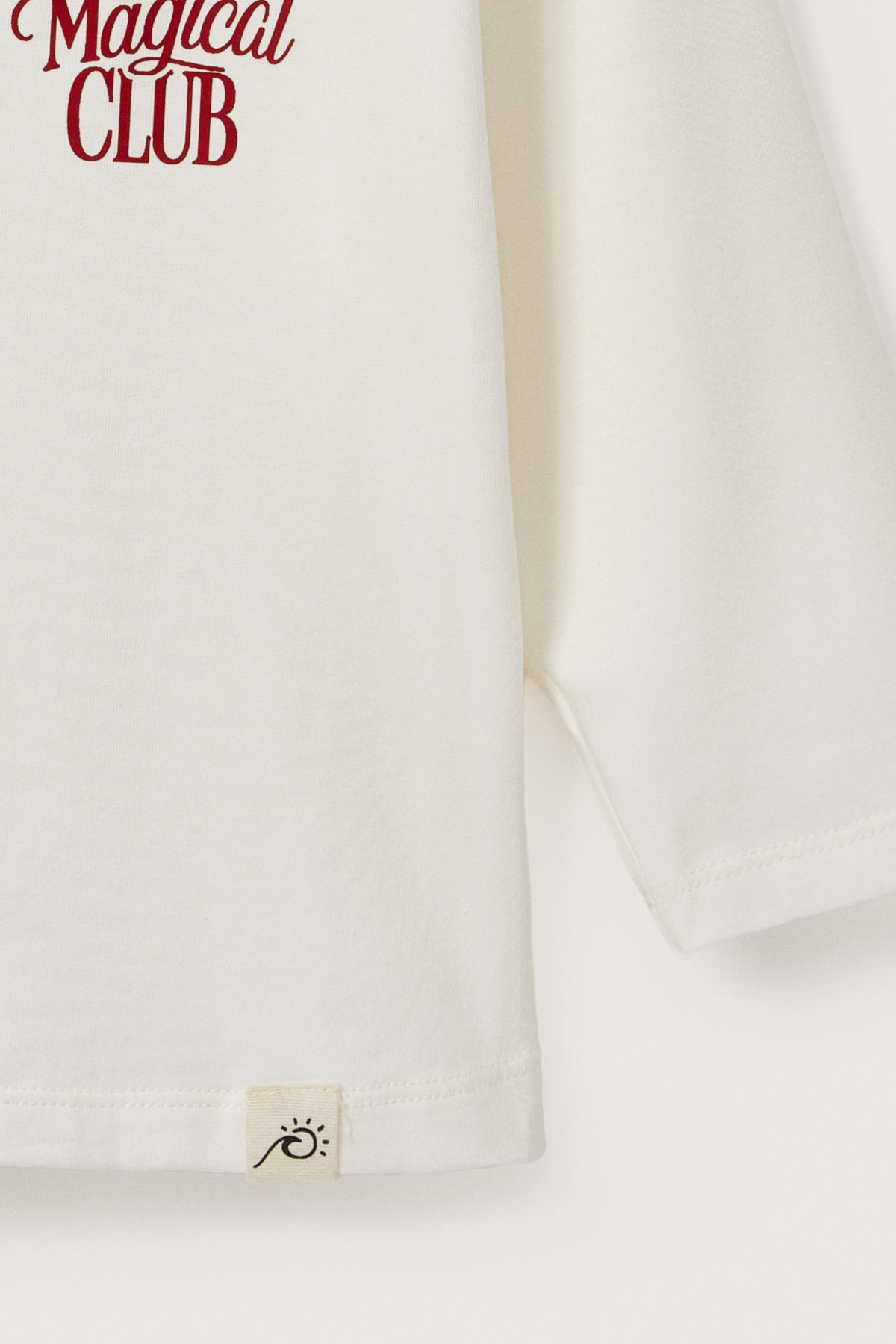 Gelince Haber VerEkru uzun kollu düşük omuzlu bisiklet yaka önü slogan baskılı tırnak etiket detaylı geniş kesim likralı pamuk kumaştan çocuk t-shirt.