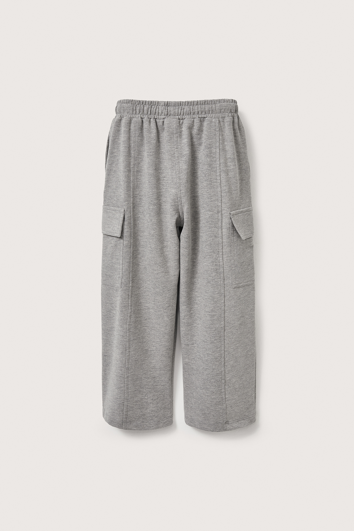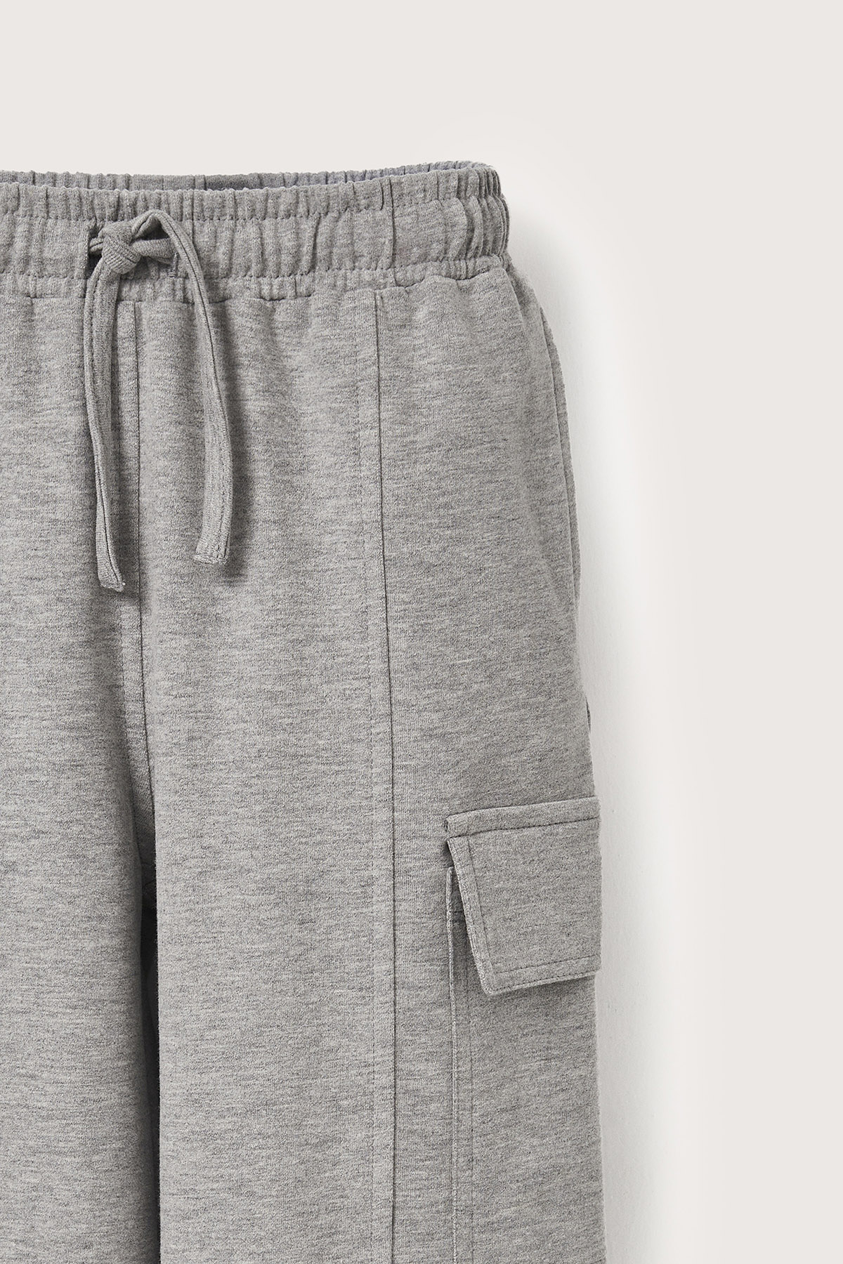 Gelince Haber VerGri melanj rengi kargo cepli beli lastikli bağlama detaylı nakışlı önden dikişli geniş kesim likralı pamuk kumaştan çocuk pantolon.