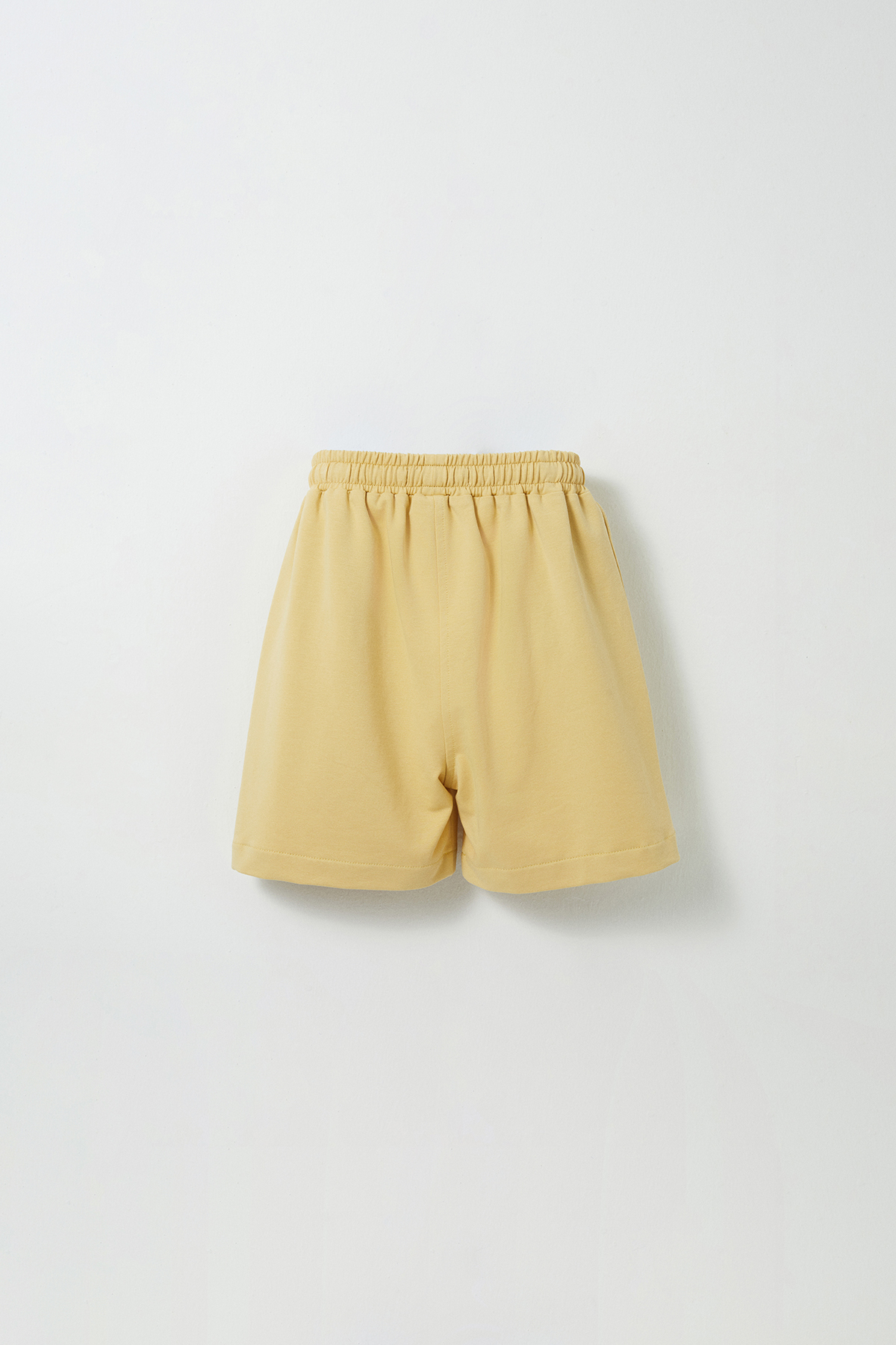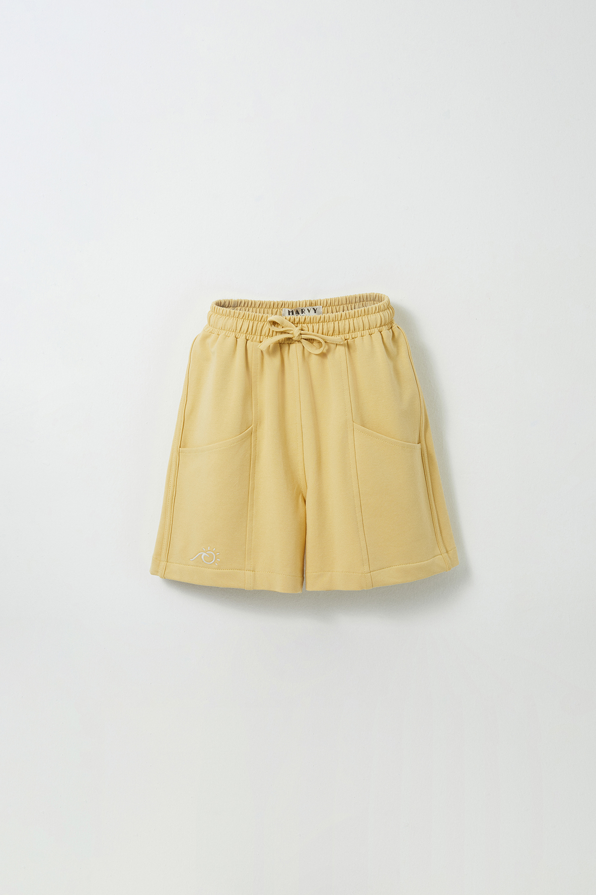 Notify me when its in stockYellow, elastic waistband, drawstring, pocketed, embroidered, stitch-detailed, made of stretchy cotton fabric, unisex children's bermuda shorts.